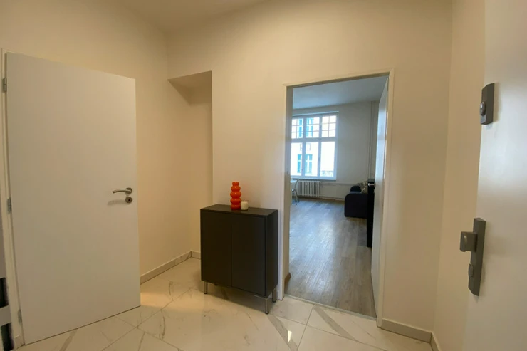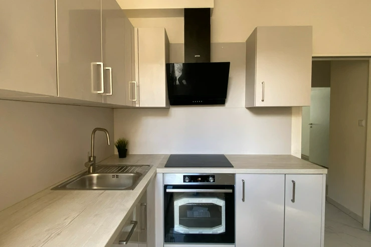 Interiér bytu zahrnuje prostorný obývací pokoj, samostatnou kuchyň se spíži, kuchyň je vybavena spotřebiči (lednice, trouba s varnou deskou myčka), ložnici a koupelnu s vanou a WC. Všechny místnosti jsou světlé a nabízejí dostatek prostoru pro pohodlné bydlení.