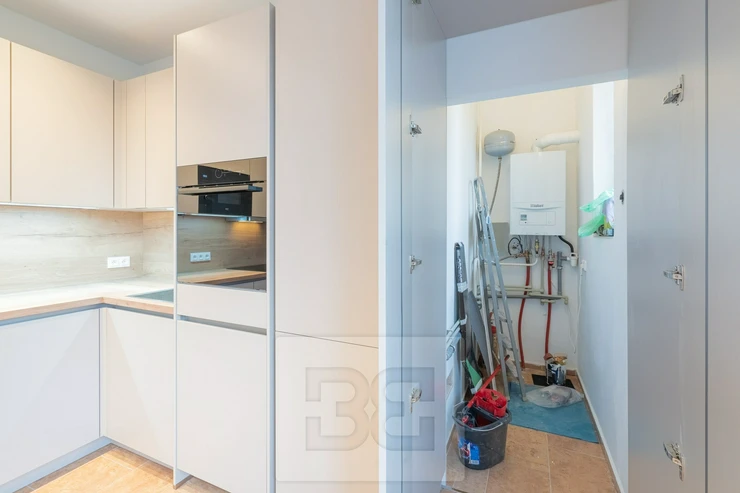 The apartment further features a separate kitchen of 11 m², which is fully equipped with appliances. Behind the kitchen, there is a practical utility room.