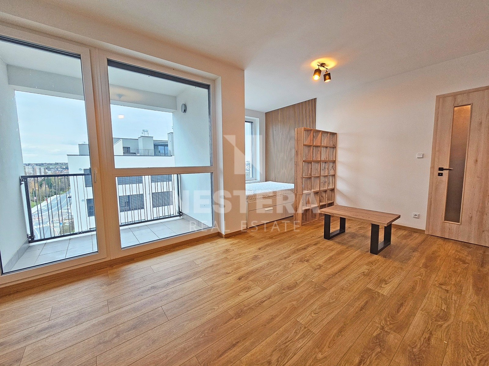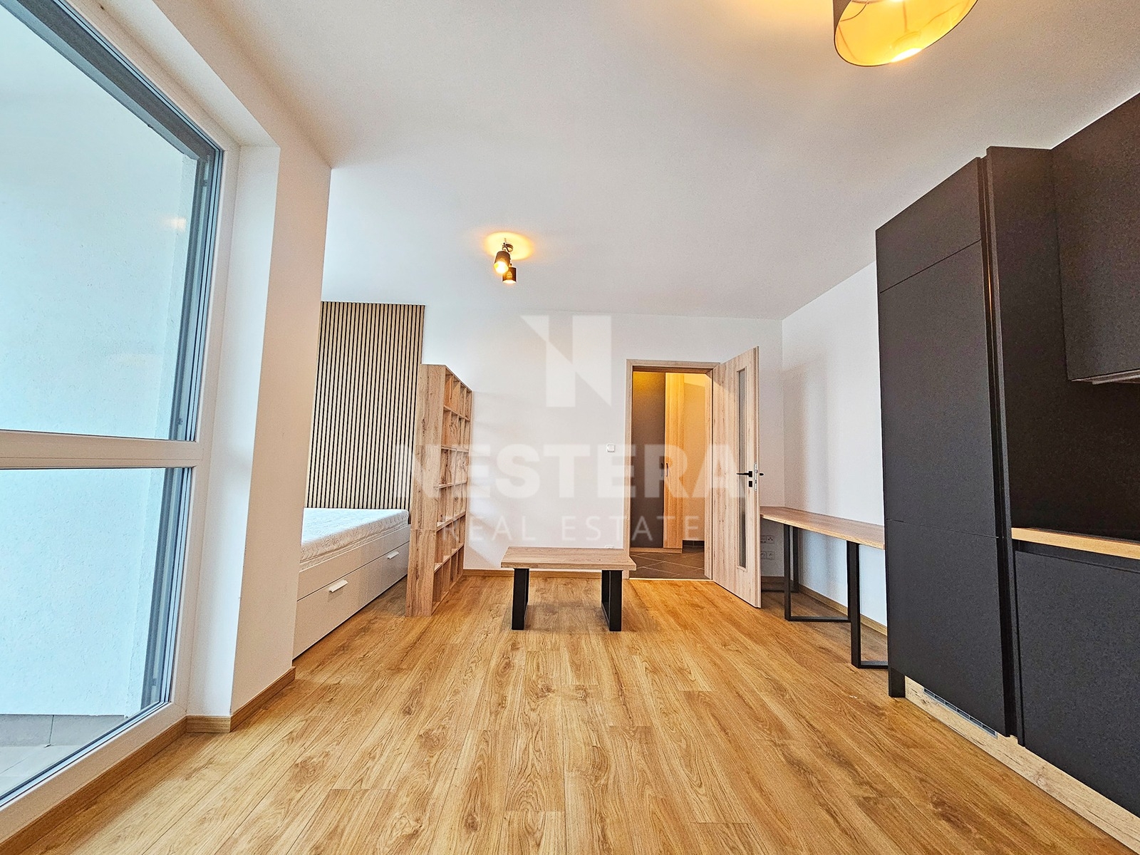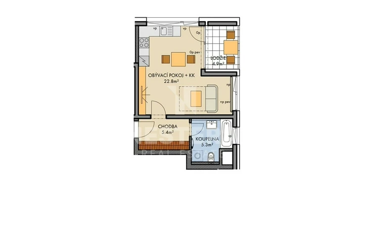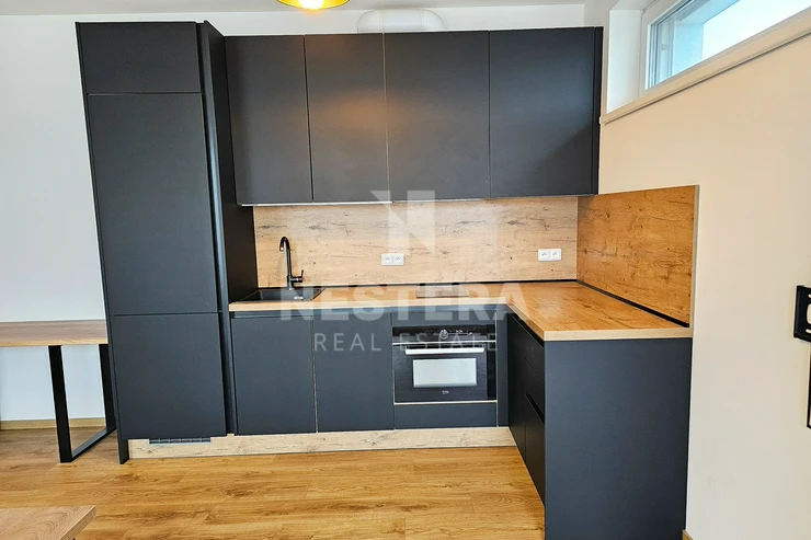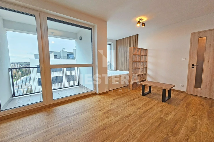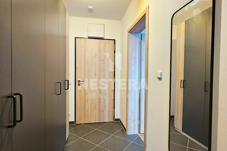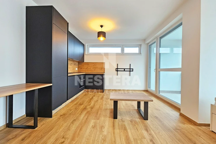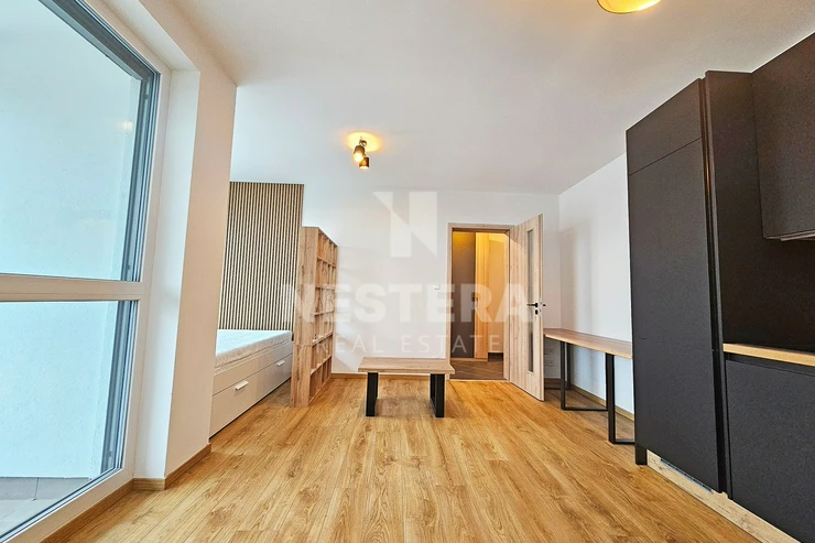 The apartment is thoughtfully divided into a spacious hallway with a built-in wardrobe, a bathroom with a bathtub and toilet (prepared for a washing machine and dryer), and a large, bright living room (23 m², southeast-facing) with a fully equipped modern kitchenette. The living room provides direct access to the 5 m² loggia.