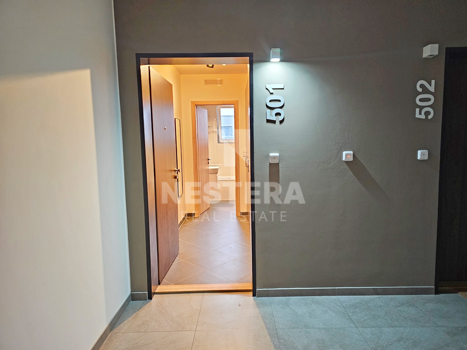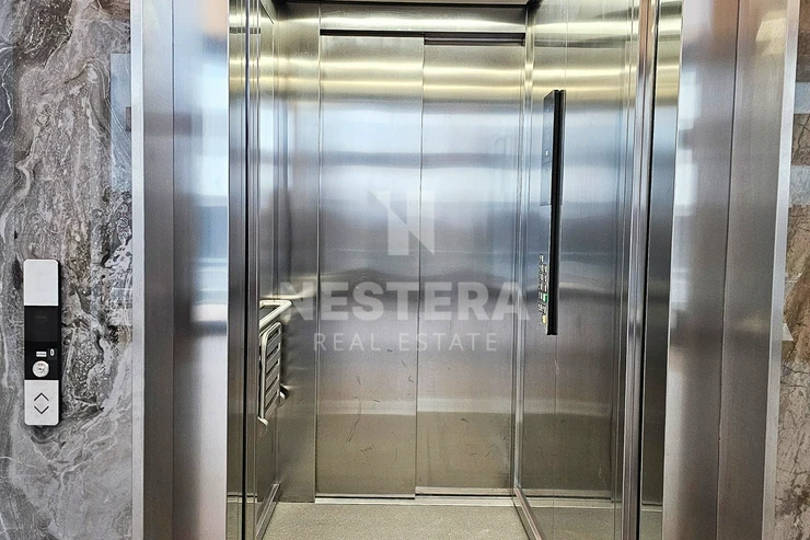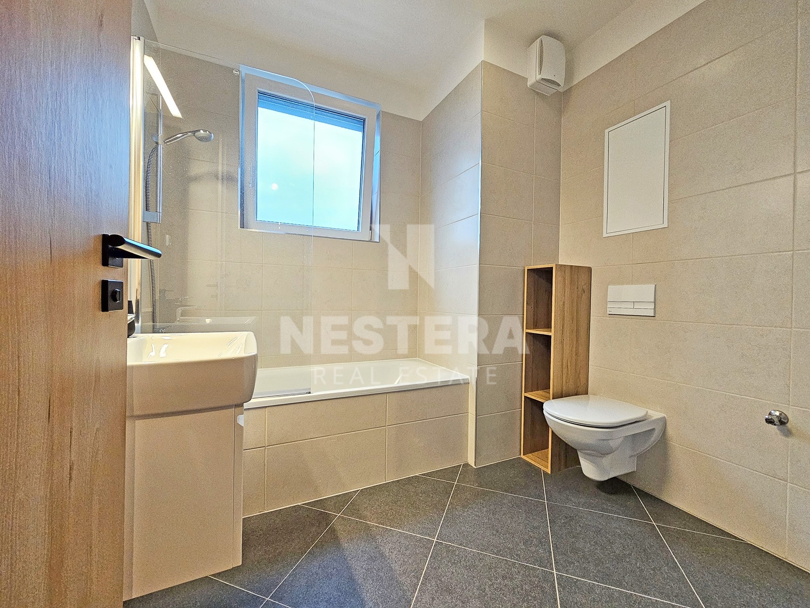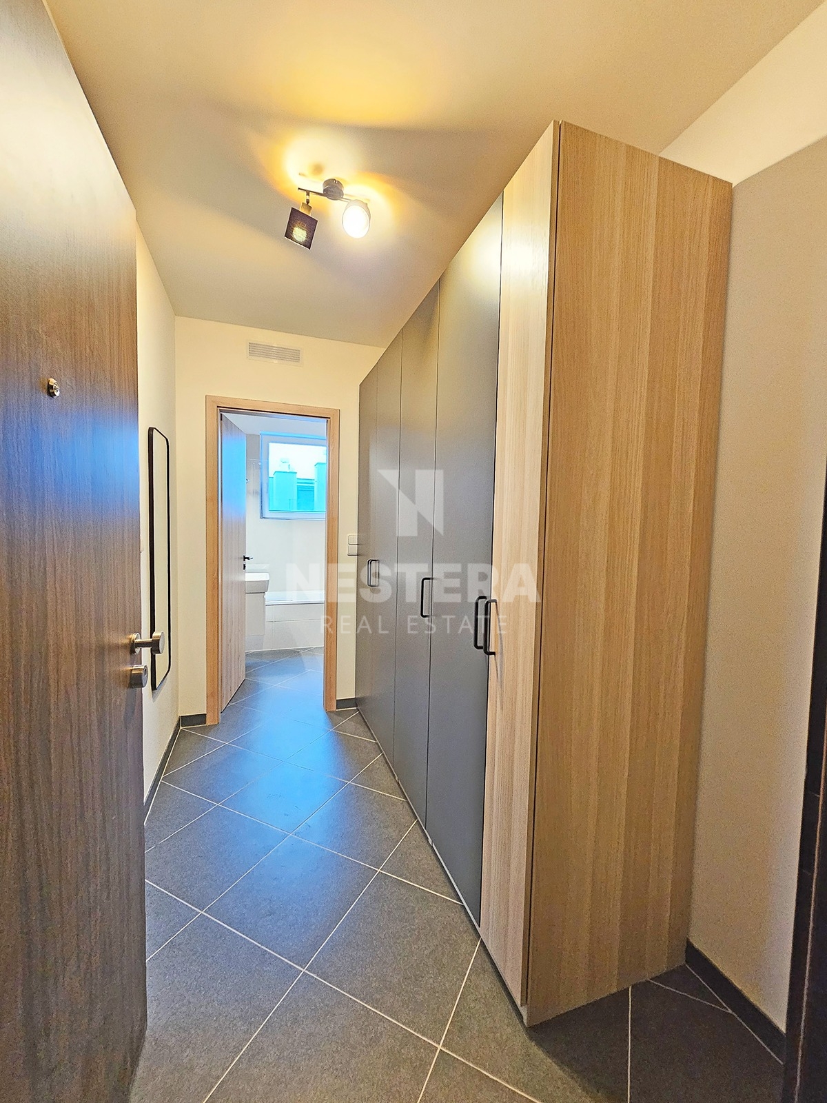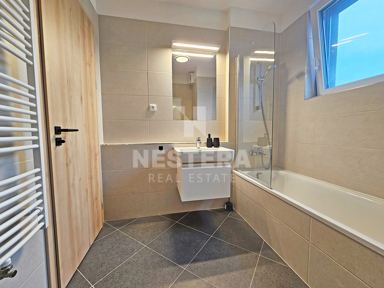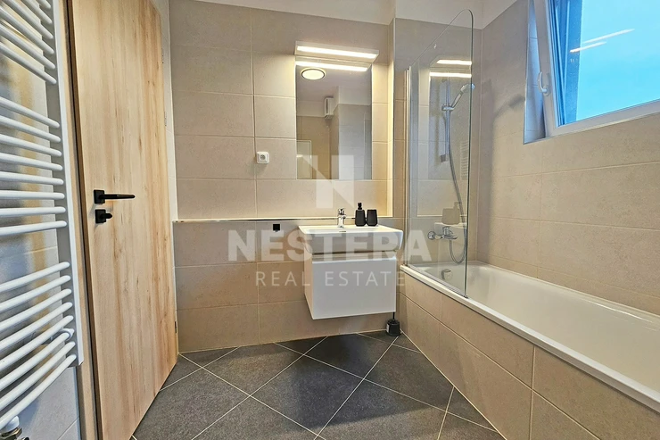 The apartment is equipped with external blinds and quality furniture. The bathroom includes a cabinet under the sink, a glass screen on the bathtub, a recessed mirror with lighting, and other premium features.