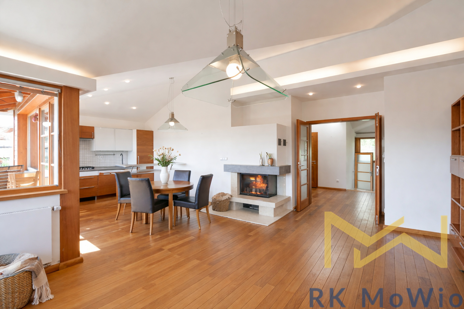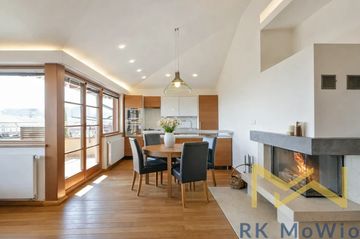 The layout features a private entrance, an entrance hall, a spacious living room with a fully equipped kitchenette, dining area and a fireplace clad in Italian marble with access to a south-facing balcony overlooking Prokopské Valley, two bedrooms, a bathroom (bathtub, washbasin, toilet), a separate guest toilet, and a utility room. The apartment is equipped with a kitchen unit and appliances (dishwasher, oven, cooktop, fridge with freezer), washing machine, oak parquet floors and interior doors, Italian tiles, Laufen sanitary ware, videophone, security system, and satellite connection.