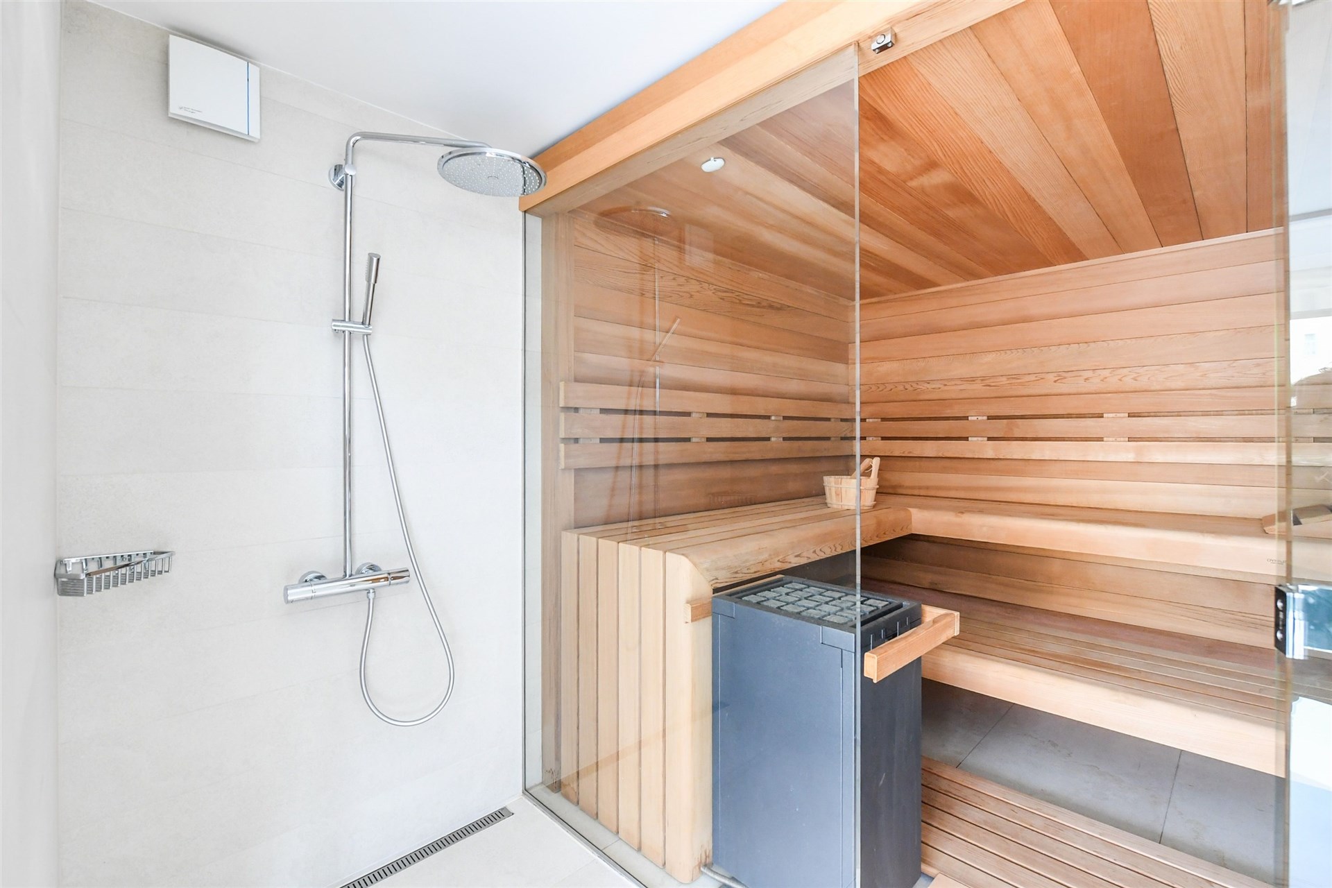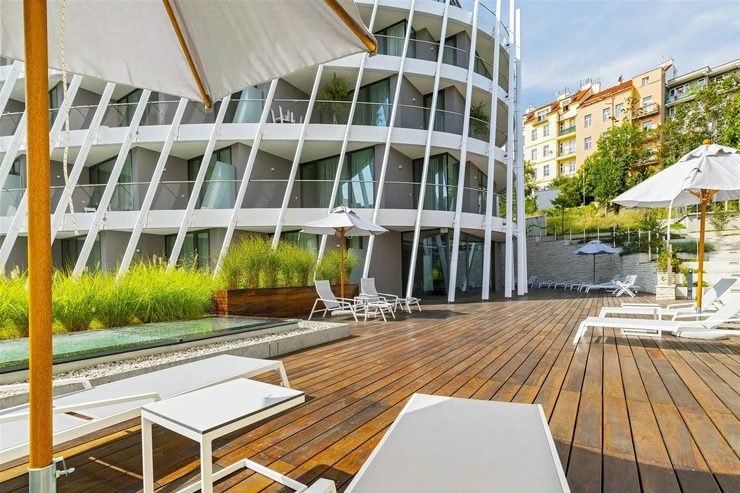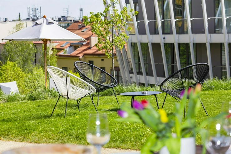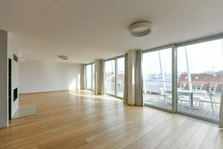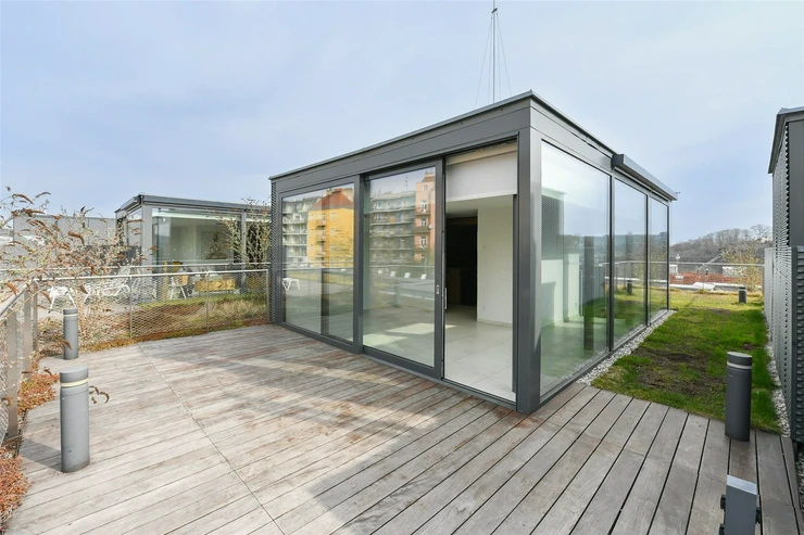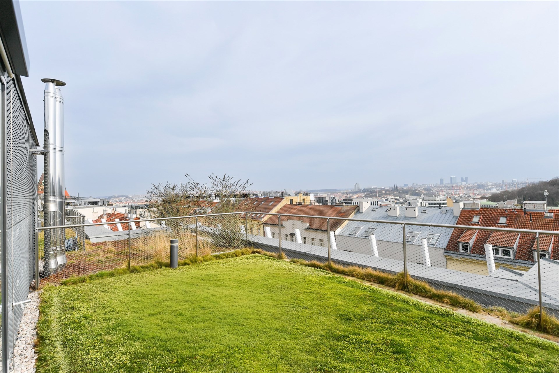 The layout of the apartment with a total area of 212 m² includes an entrance hall, a prestigious living room of 65 m² with a fully equipped kitchenette, facilities including a dressing room, three separate bedrooms, and three bathrooms. The highlight of the apartment is its three spacious terraces totaling 80 m², offering panoramic views of Prague and private greenery. Two terraces are located on the 6th floor, while the third rooftop terrace offers maximum privacy and relaxation space, including a private garden of 31 m². The apartment also features its own wellness pavilion with a sauna, providing unique living comfort.