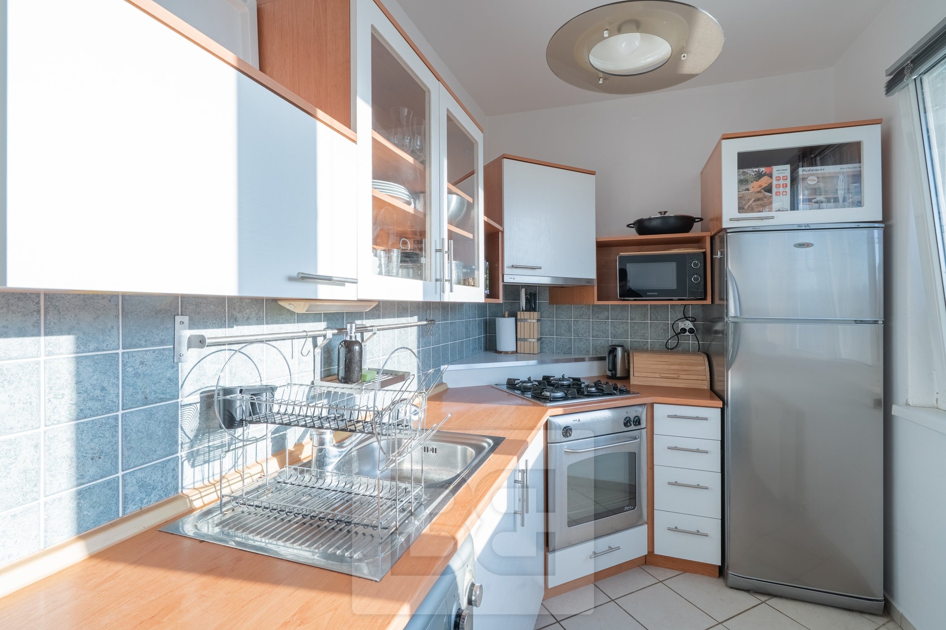 The kitchen is equipped with a refrigerator, washing machine, cooktop, and oven.