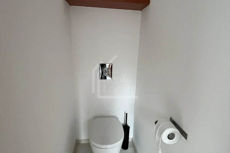 On the upper floor, there is a bedroom with built-in wardrobes, a bathroom with a corner bathtub, a study suitable for a home office, and another separate toilet.