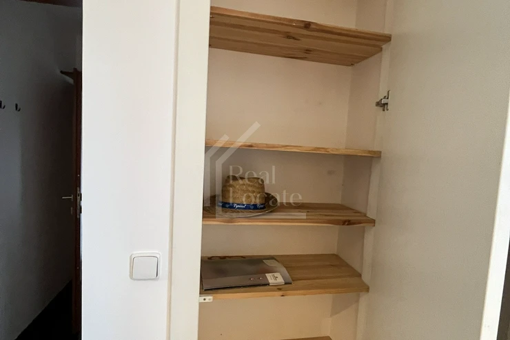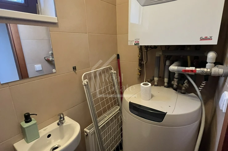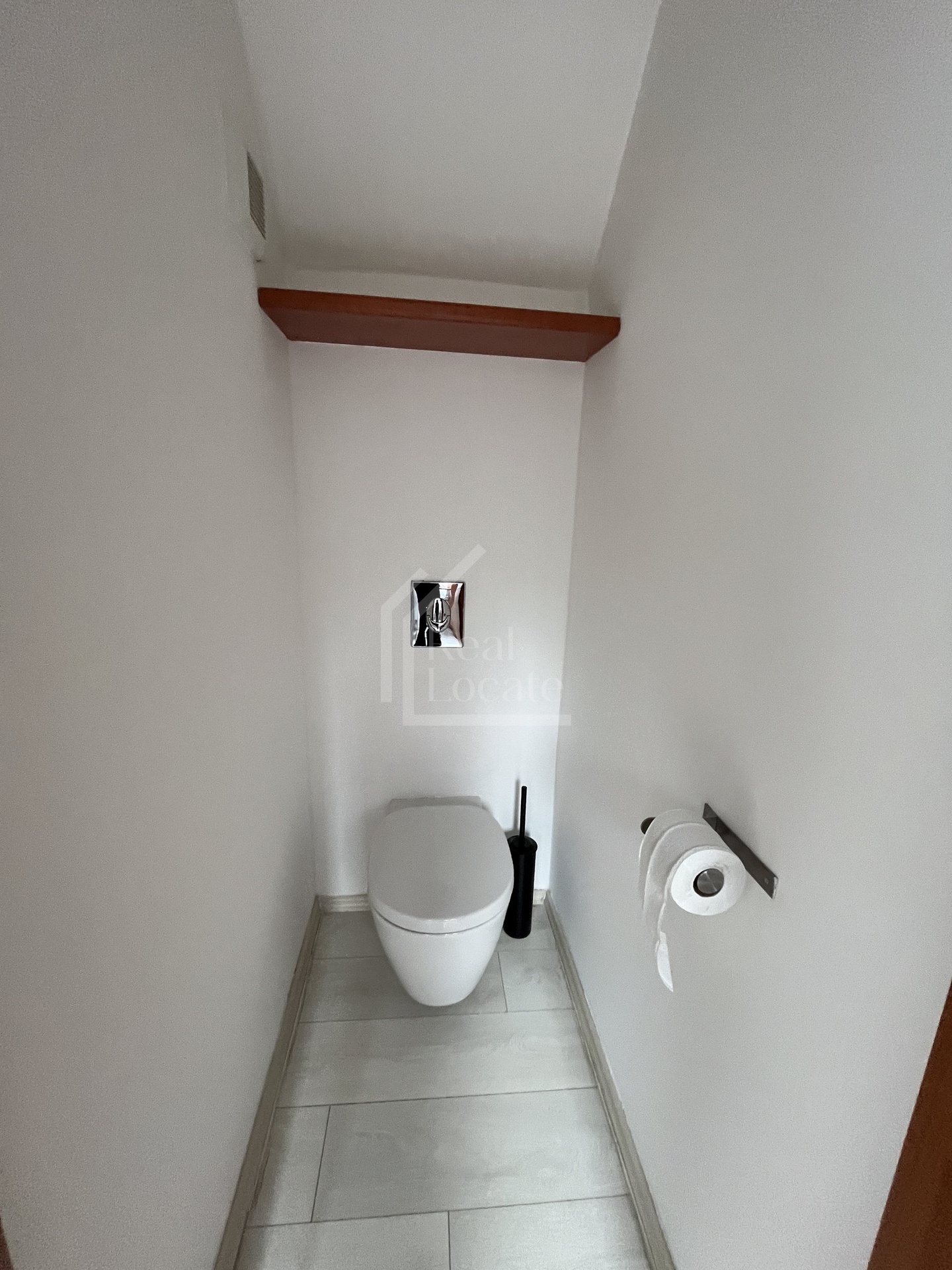 The apartment is spread over two levels. On the first floor, there is an entrance hall, a bright living room with Smart TV, and a fully equipped kitchenette (fridge, freezer, hob, oven, dishwasher, washing machine). There is also a dining area, pantry, and a separate toilet.