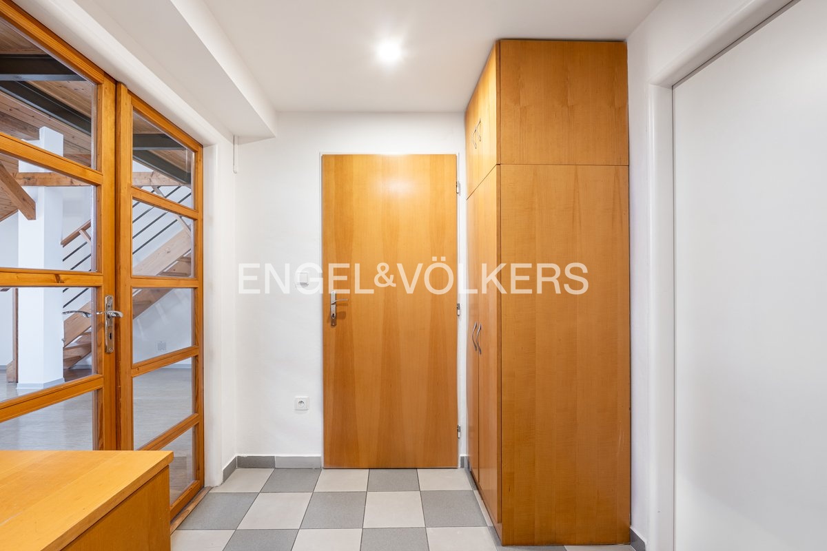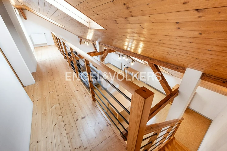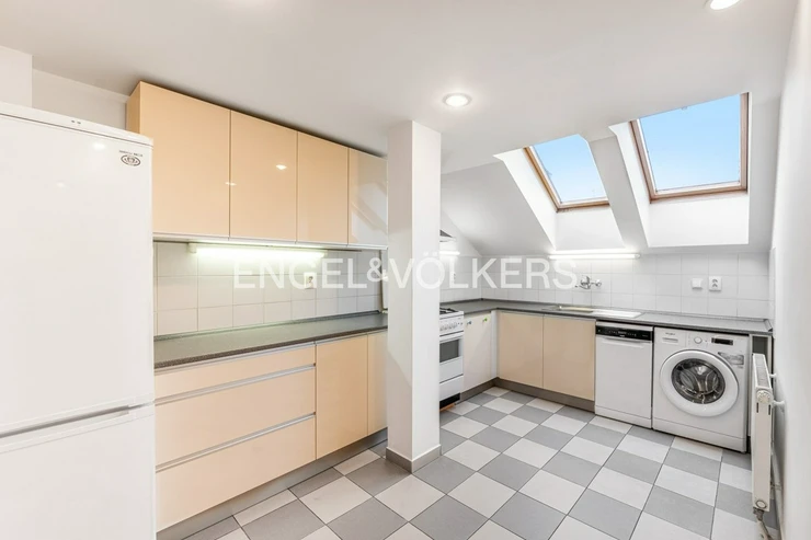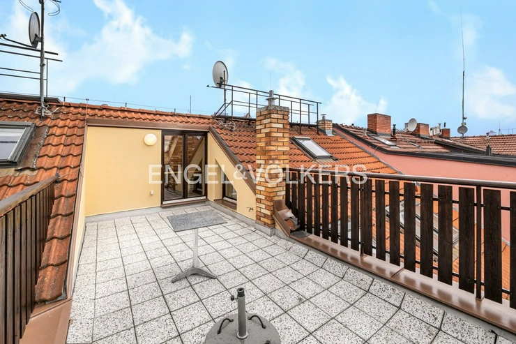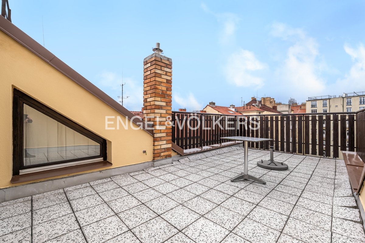 A duplex apartment is available for rent, located on the fourth and fifth floor of a historic apartment building in Smíchov.