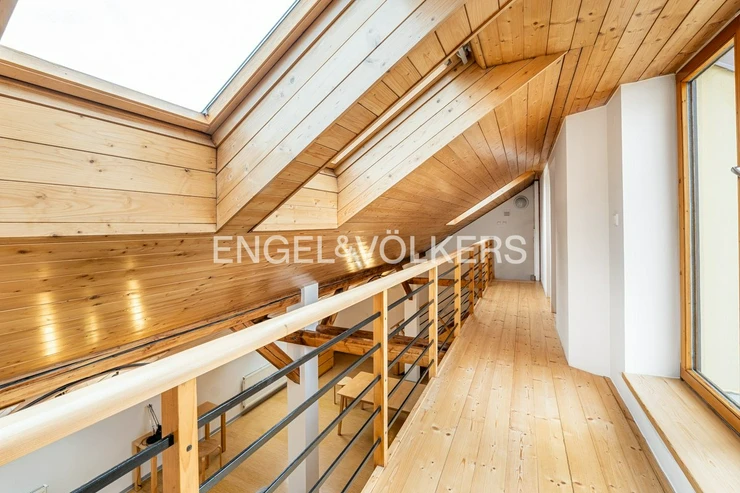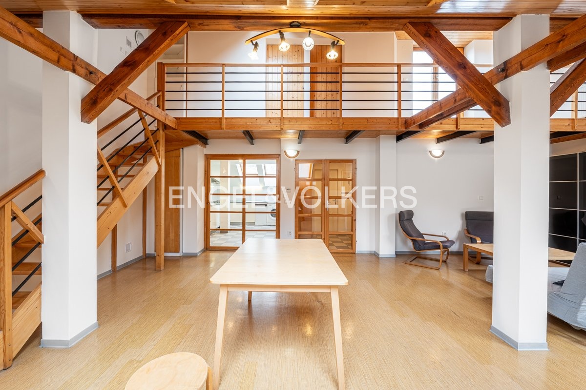 The centrepiece of the apartment is the living room, from which stairs lead to the upper floor, where a gallery and a bedroom are located. The upper floor also features a spacious terrace.