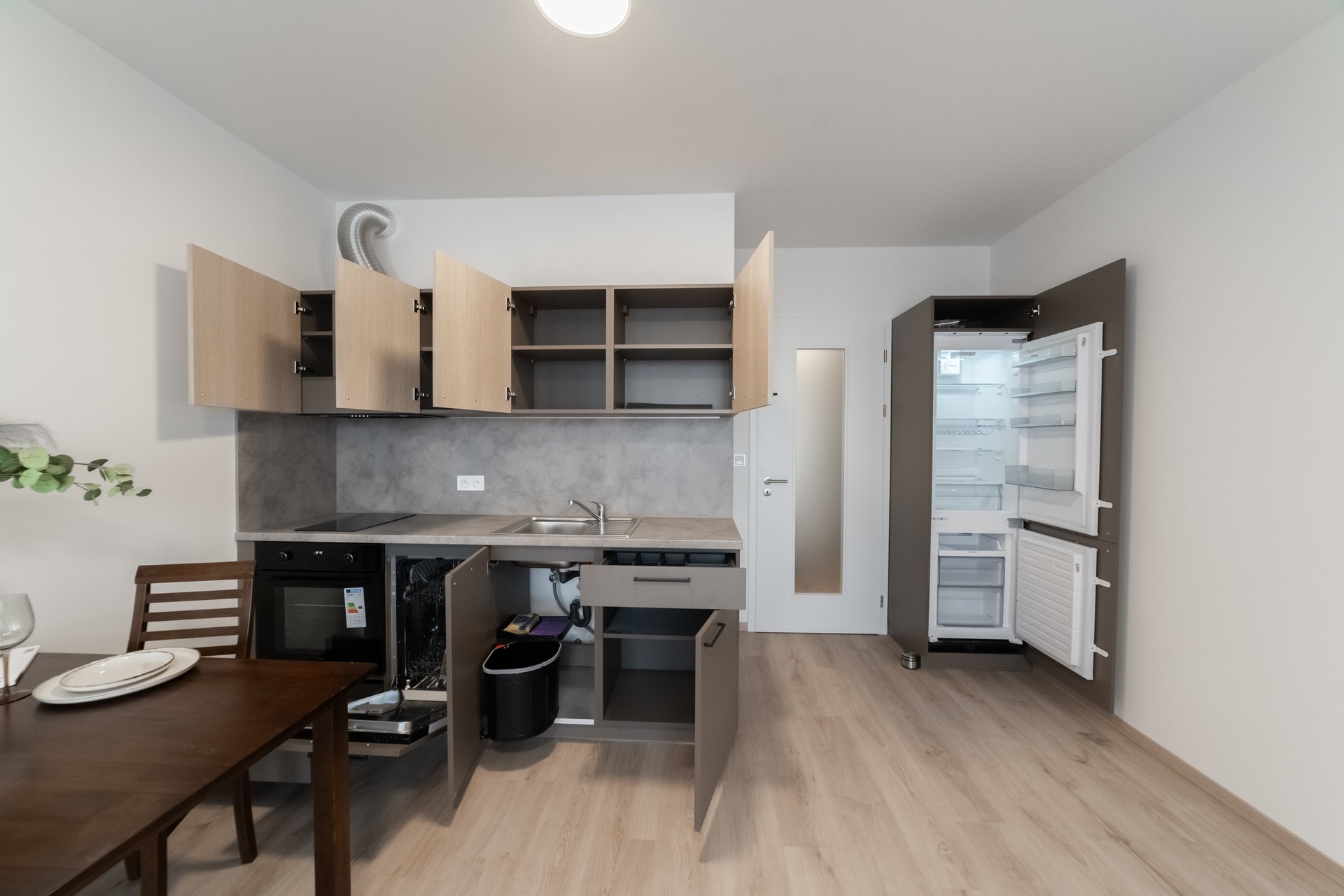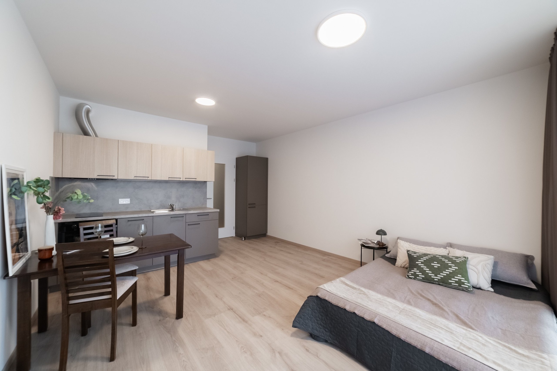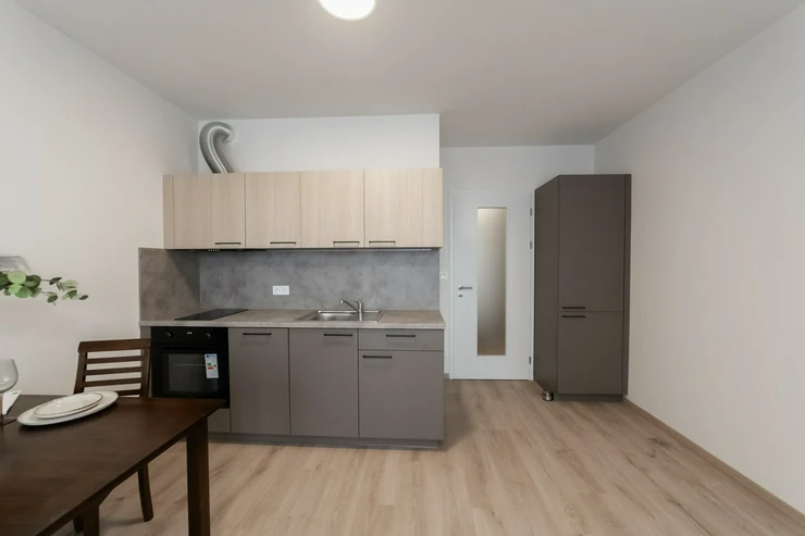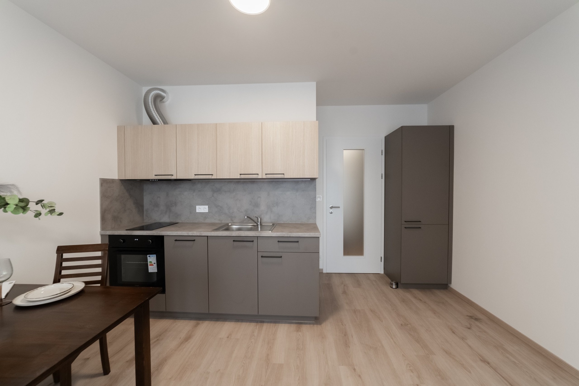 Součástí nájmu je kuchyňská linka s troubou a indukční deskou. Koupelna je vybavena sprchovým koutem a má volný prostor pro pračku a sušičku.