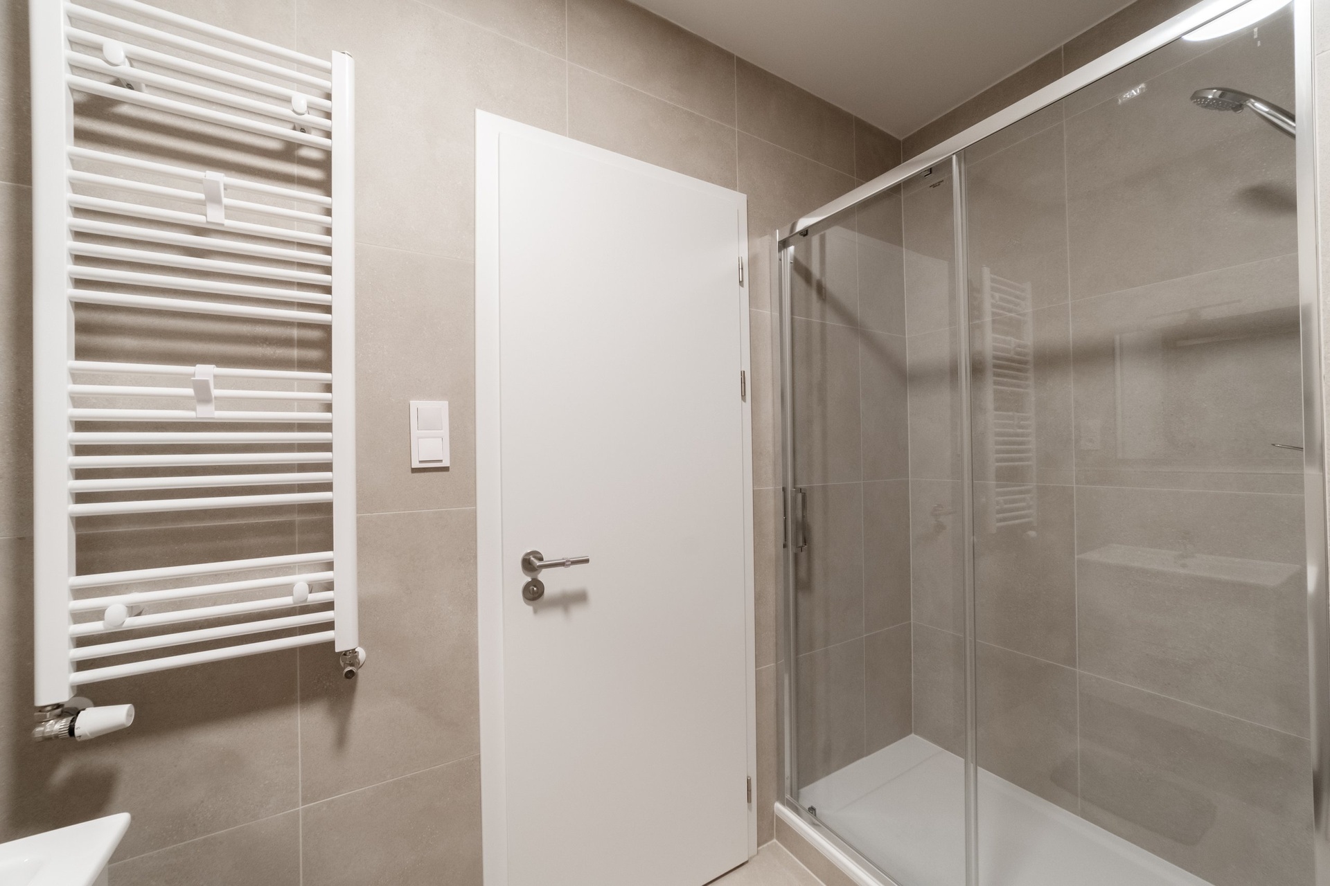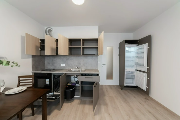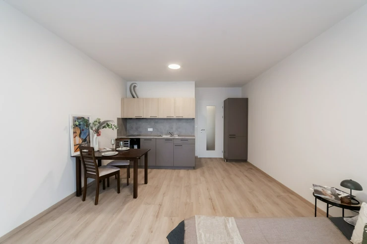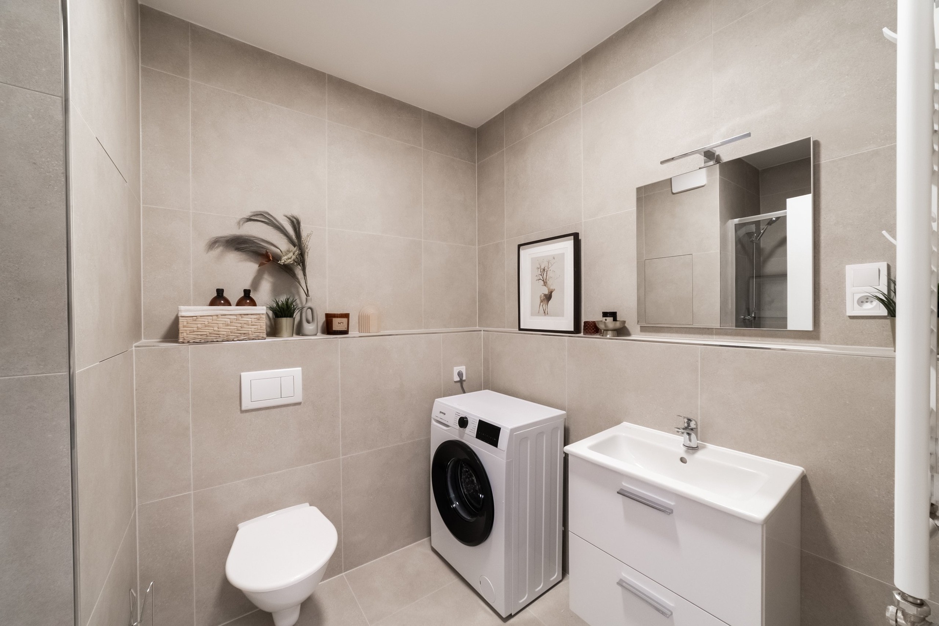 Součástí nájmu je kuchyňská linka s troubou a indukční deskou. Koupelna je vybavena sprchovým koutem a má volný prostor pro pračku a sušičku.