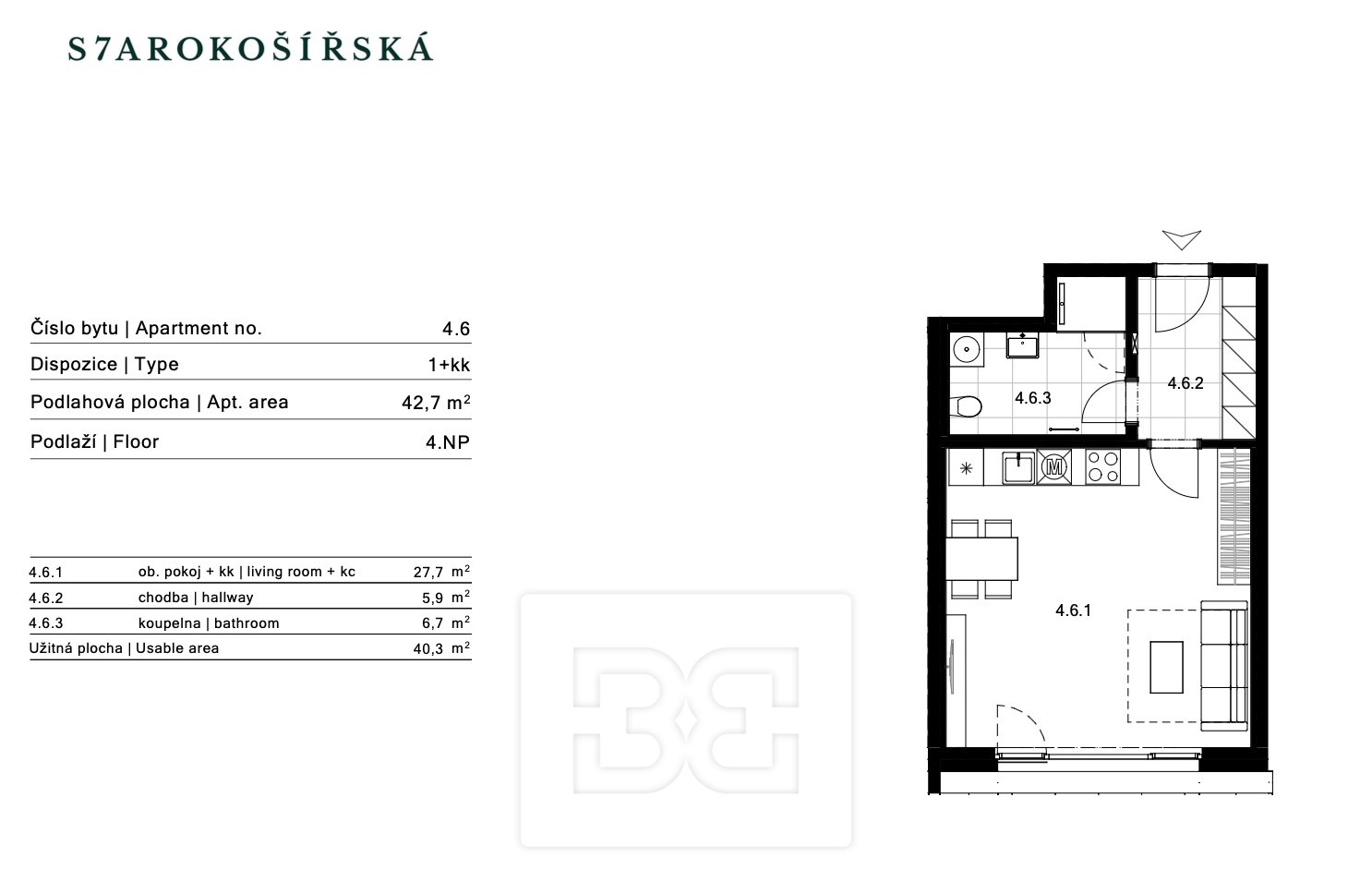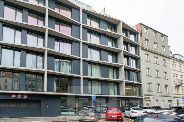 The apartment is located on the 4th floor of a newly completed residential building in the attractive area of Prague 5 – Košíře, within the Starokošířská 7 residential project. The interior is finished to a high standard.
