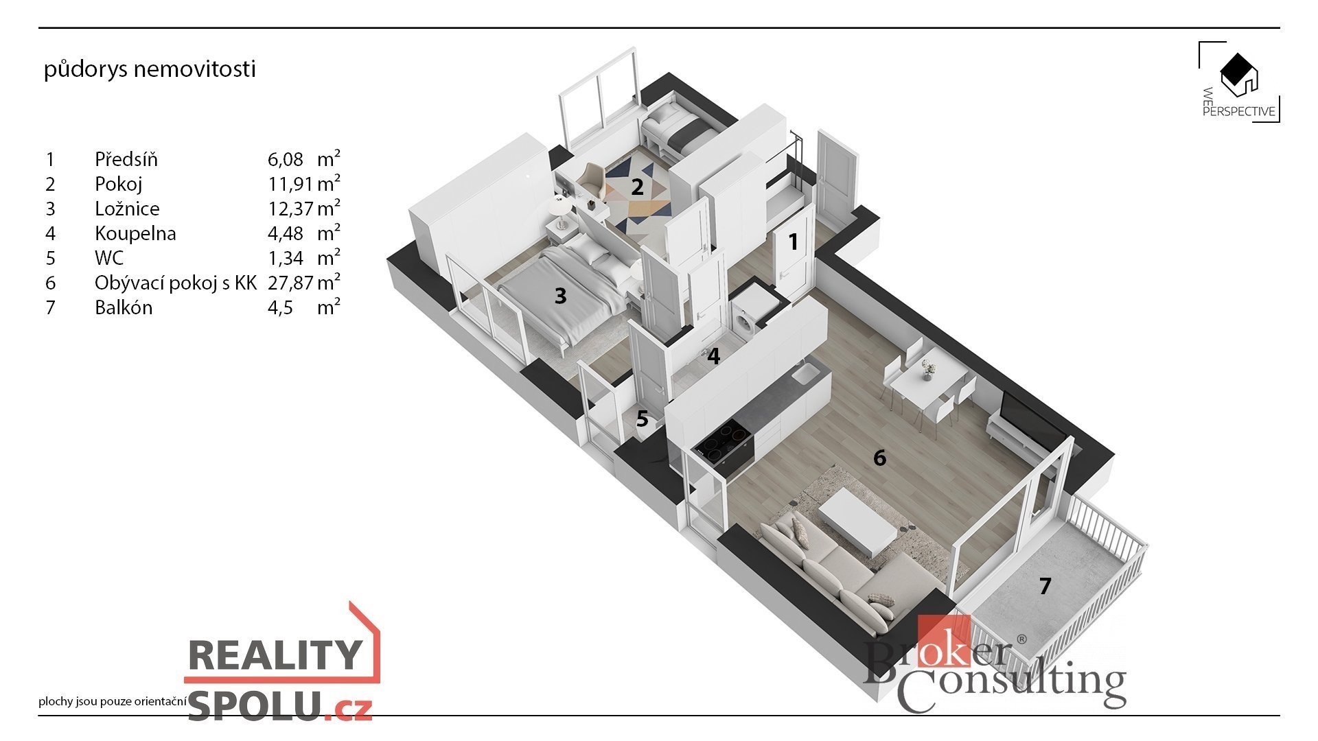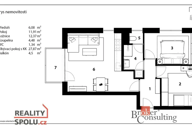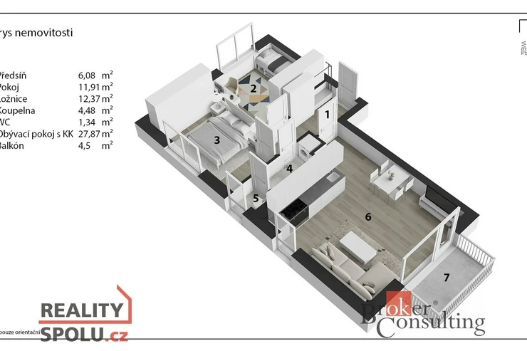 Byt tvoří prostorná chodba, 2 samostatné neprůchozí pokoje, koupelna, WC, obývací pokoj s kuchyňským koutem a balkón.