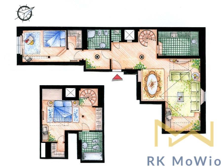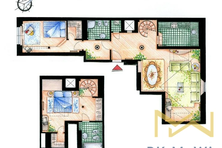 We offer for rent a luxury furnished duplex 2-bedroom apartment with a total floor area of 108 sqm, situated on the 5th and 6th floors (6th and 7th above-ground levels) of a building with an elevator in the attractive location of Prague 2 – Nové Město, near Karlovo náměstí. The property is located in the historic city center with excellent transport accessibility and full civic amenities in the immediate vicinity.