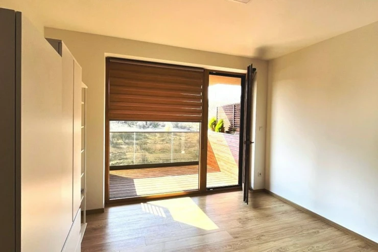 Slunná terasa obložená dřevem s výhledem do přírody na Slánskou horu vybízí k odpočinku a od jara do podzimu ji lze využít jako další obytný prostor. Na okně i dveřích vedoucích na terasu oceníte elegantní žaluzie.