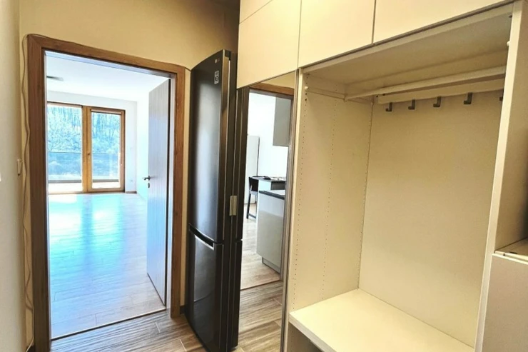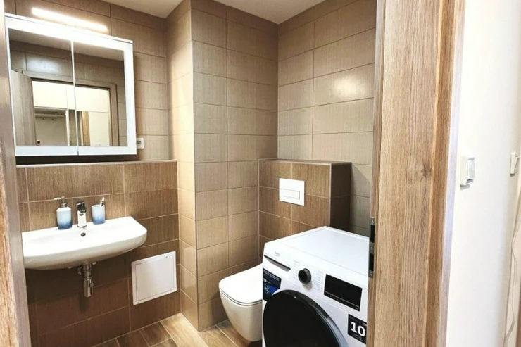 Byt se pronajímá částečně vybavený – k dispozici je kuchyňský kout, vestavěná skříň v chodbě, volně stojící skříň v obytné místnosti, lednice a pračka. Ostatní vybavení si můžete zařídit podle vlastního vkusu a potřeb. Ze suterénu domu, kde se nachází garážové stání, se pohodlně dostanete výtahem až k bytu.