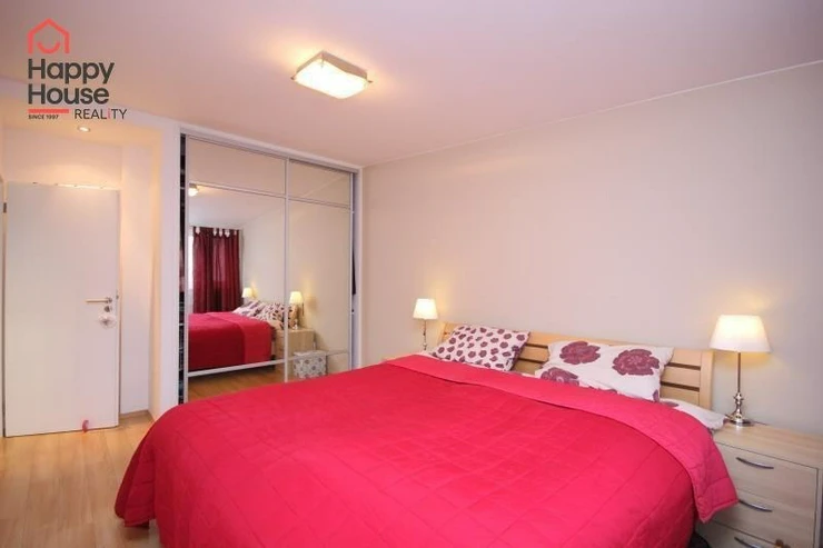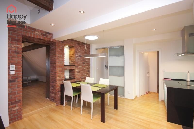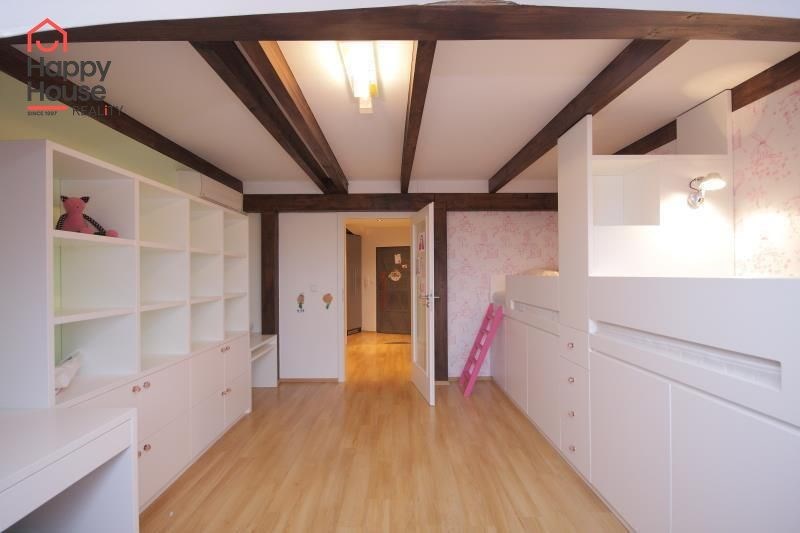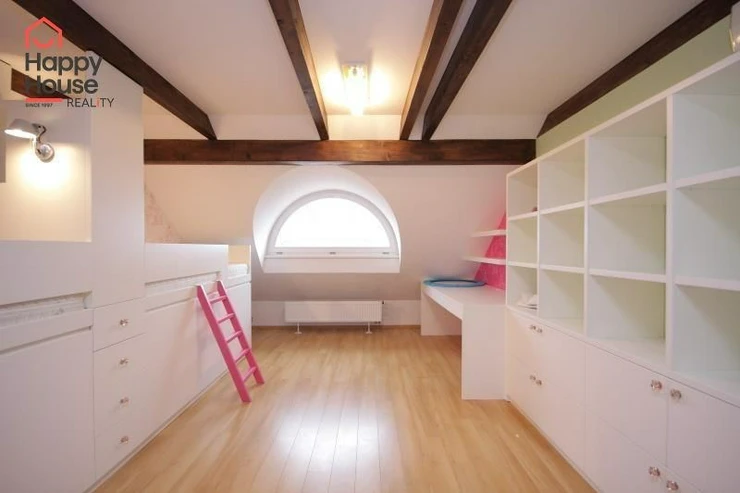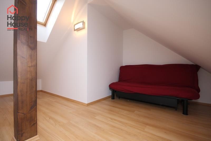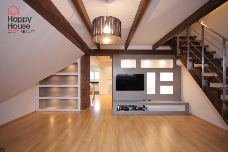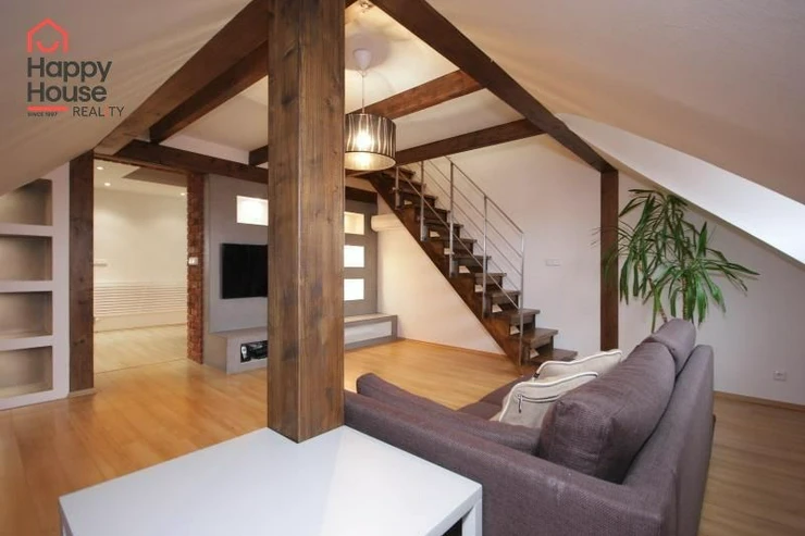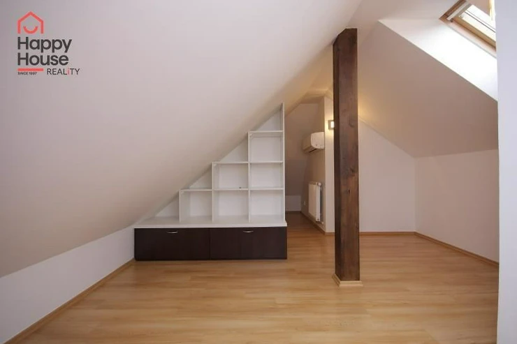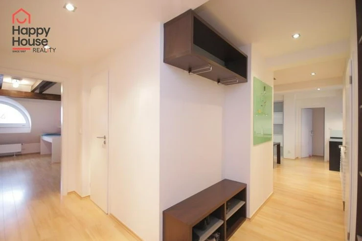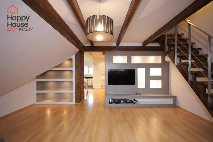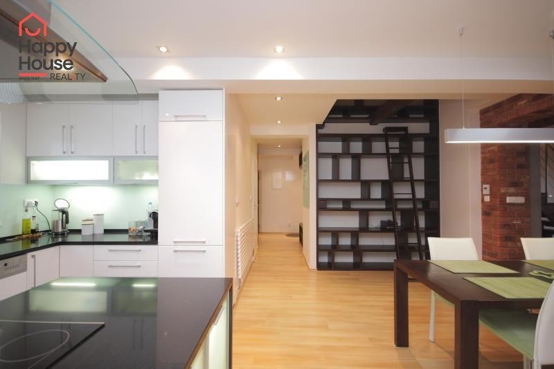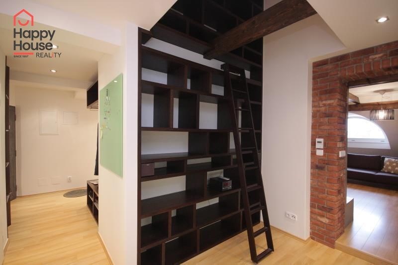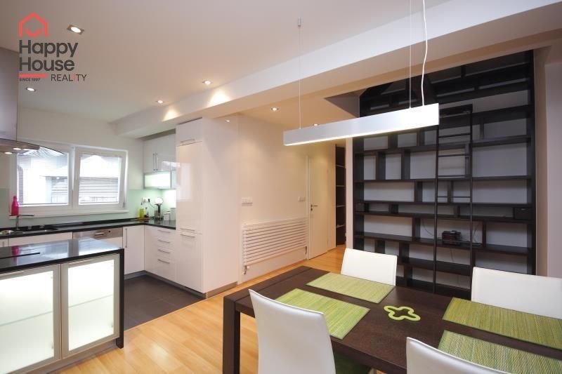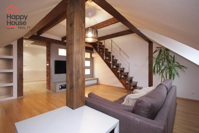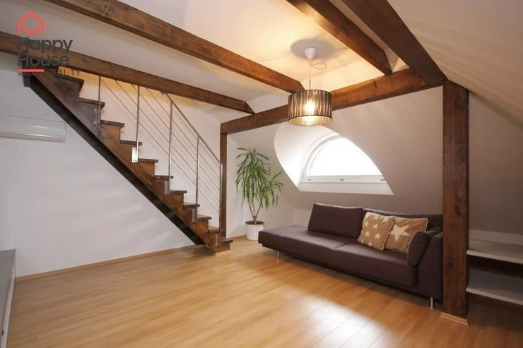 We exclusively offer for long-term rent a beautiful, luxurious duplex apartment with three bedrooms and an area of 118 sqm in a pleasant location in Prague 10 in Vršovice. The apartment is located on the 6th floor of a brick house with an elevator to the mezzanine and is partially furnished. Lower floor: Entrance hall. Modern, fully equipped kitchen with built-in appliances (fridge with freezer, ceramic hob, electric and microwave oven, dishwasher and extractor hood) and dining area and library. Spacious living area with sofa, TV and coffee table. Fully equipped children's room. Bedroom with double bed and built-in wardrobe and separate dressing room. Bathroom with bathtub, toilet and washing machine. Another toilet is separate. The stairs take you to the floor where the attic bedroom with sofa and storage space is located. There are floating floors throughout the apartment, tiles in the bathroom. The apartment includes a spacious cellar. Internet connection available. Parking on the street - zones.