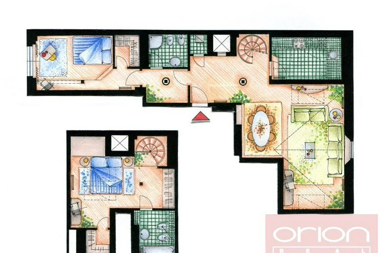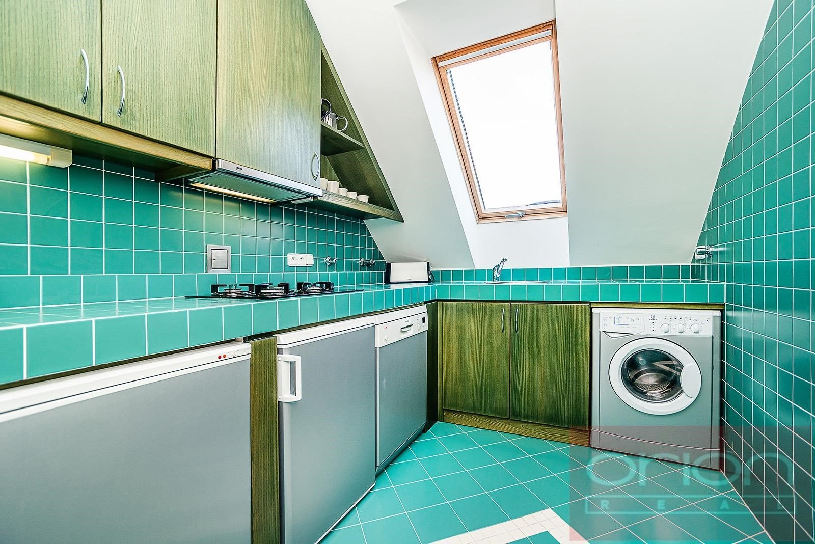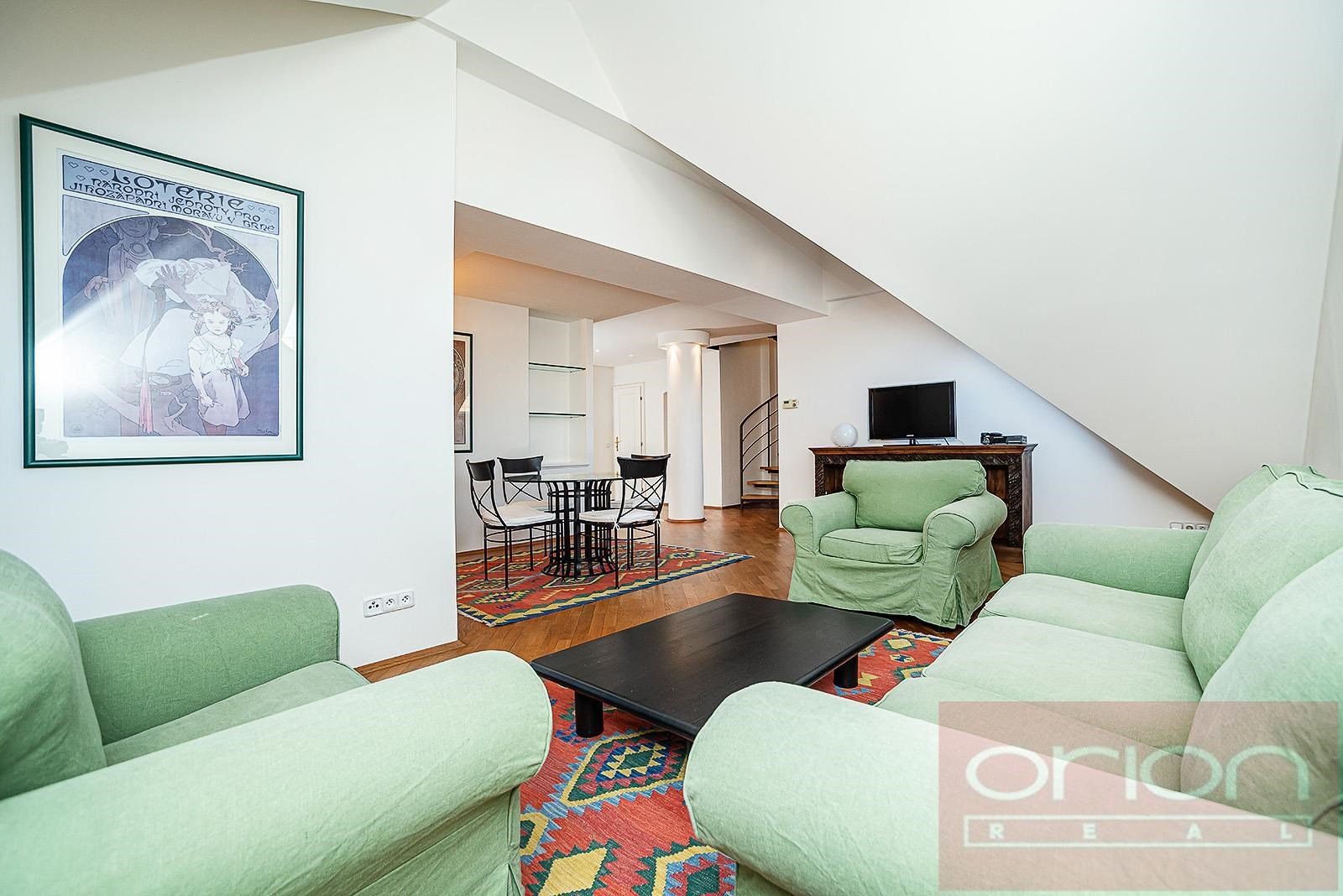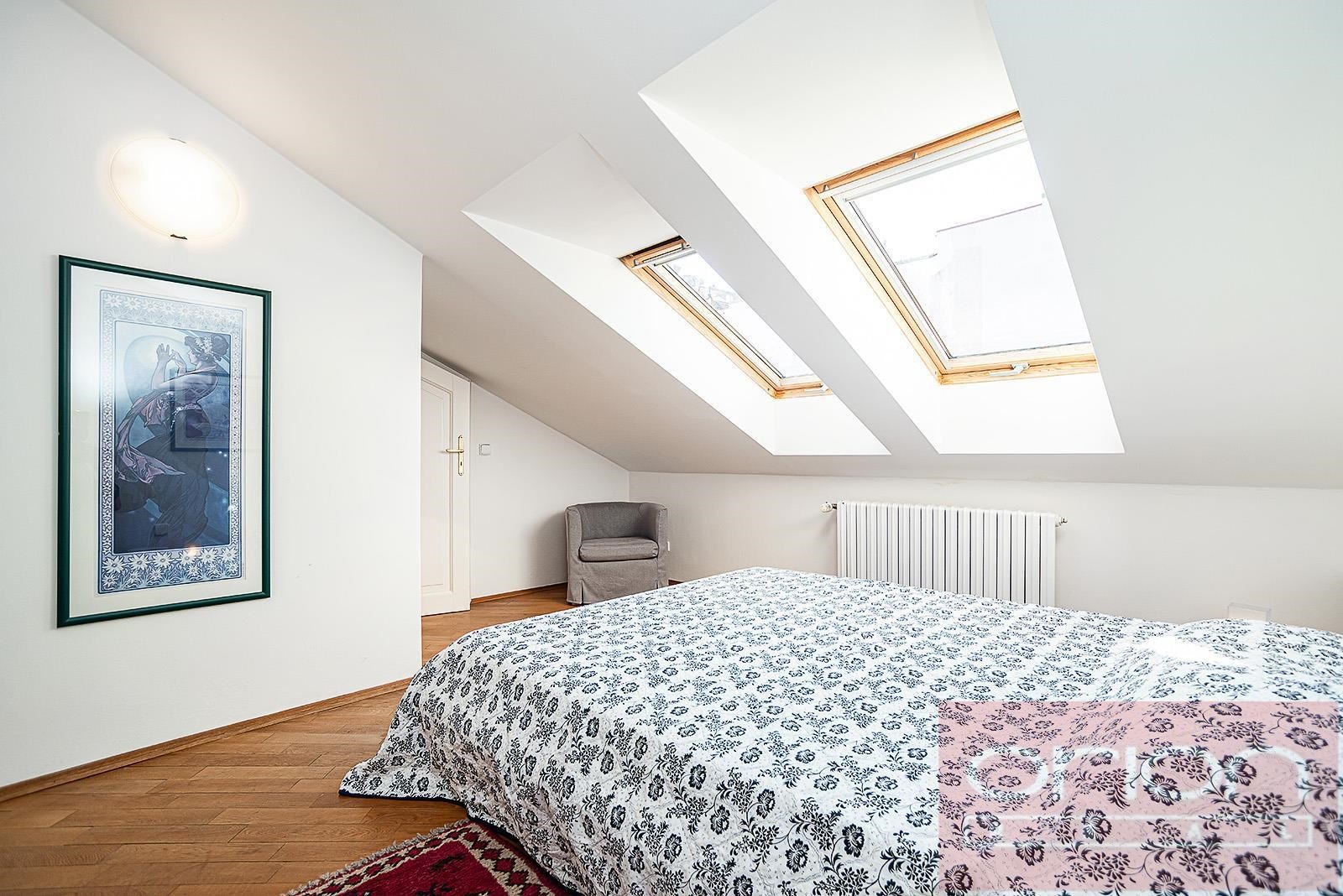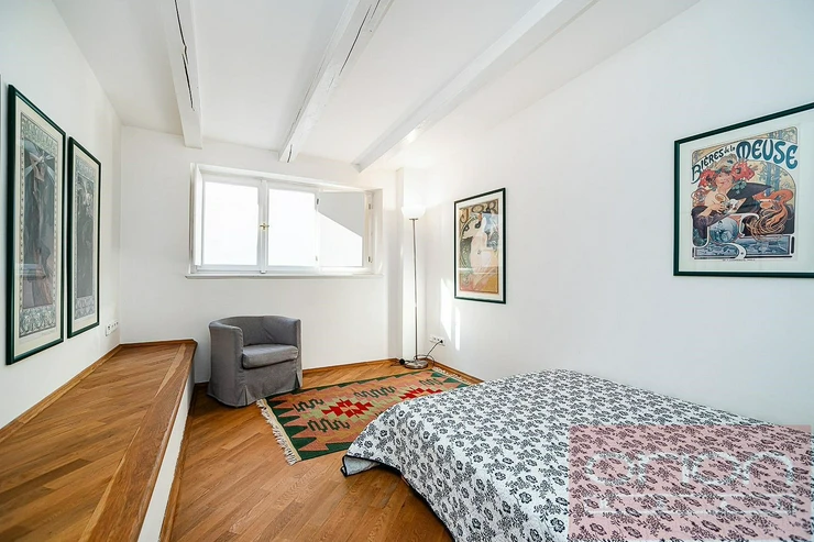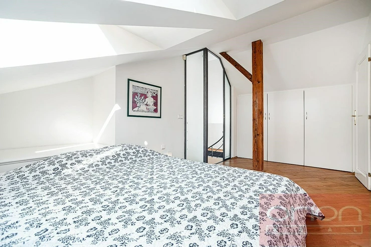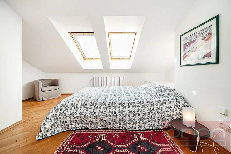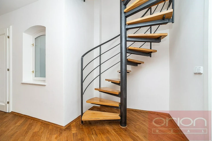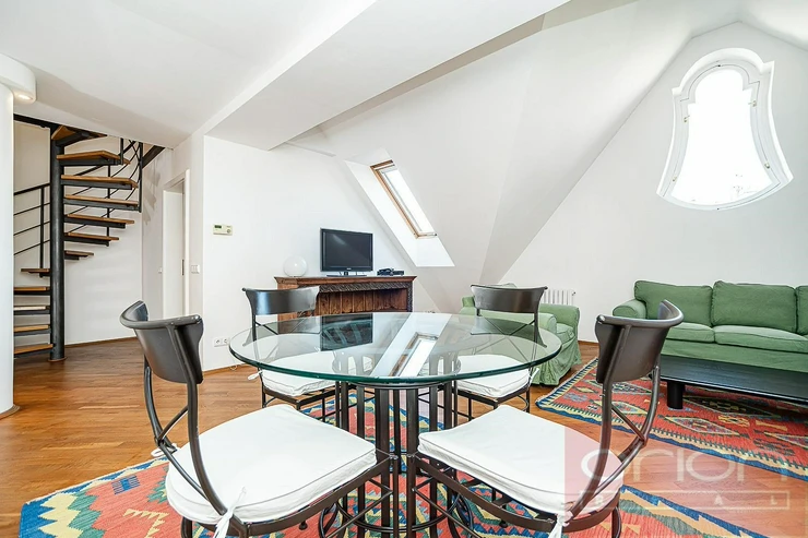 Luxurious, furnished, two bedroom duplex apartment on the 5th and 6th floor of a renovated building with a lift and views of Prague Castle. The apartment has a total area of 108 sqm and offers on the lower floor entry hall, fully fitted kitchen, living room with dining room, bedroom with dressing room, bathroom with shower, storage room. On the upper floor there is entry hall with built-in wardrobe, large bedroom with walk-in closet, bathroom with tub and views of Prague. Just a few steps from Karlovo náměstí metro station, within a short walk to tue Wenceslas Square, shops, restaurants, cafes.