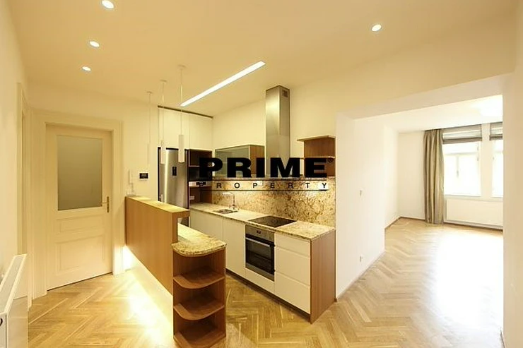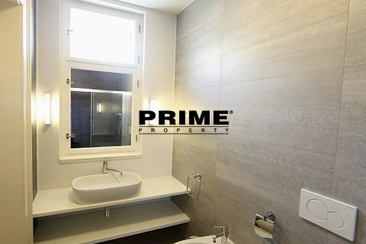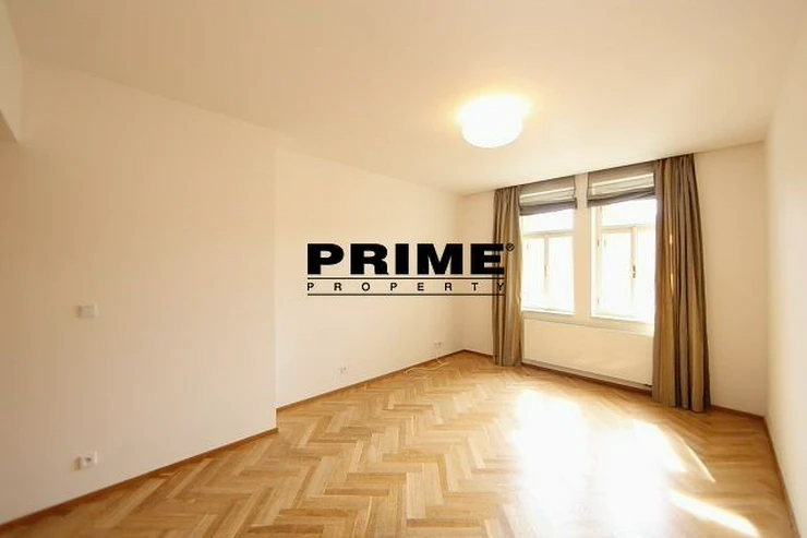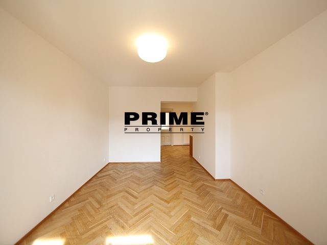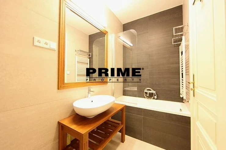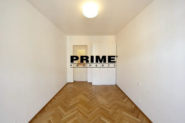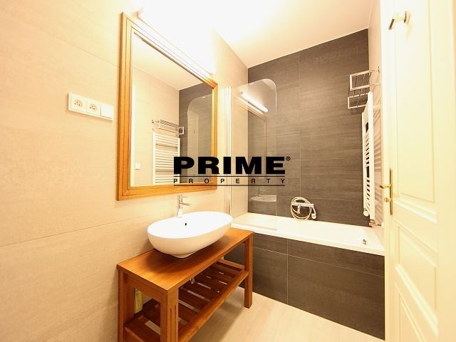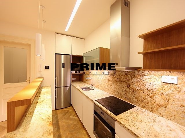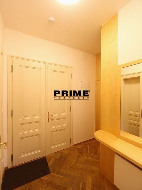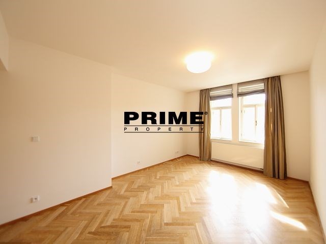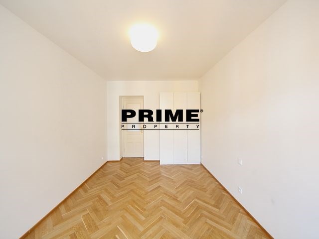 Renovated, bright and sunny, 2 bedroom, 2 bathroom, unfurnished apartment for rent, 3+kk, 94m2, with a parking space for one car in the courtyard and a cellar. The apartment is situated on the 5th floor of a renovated Art Nouveau apartment building with a lift.