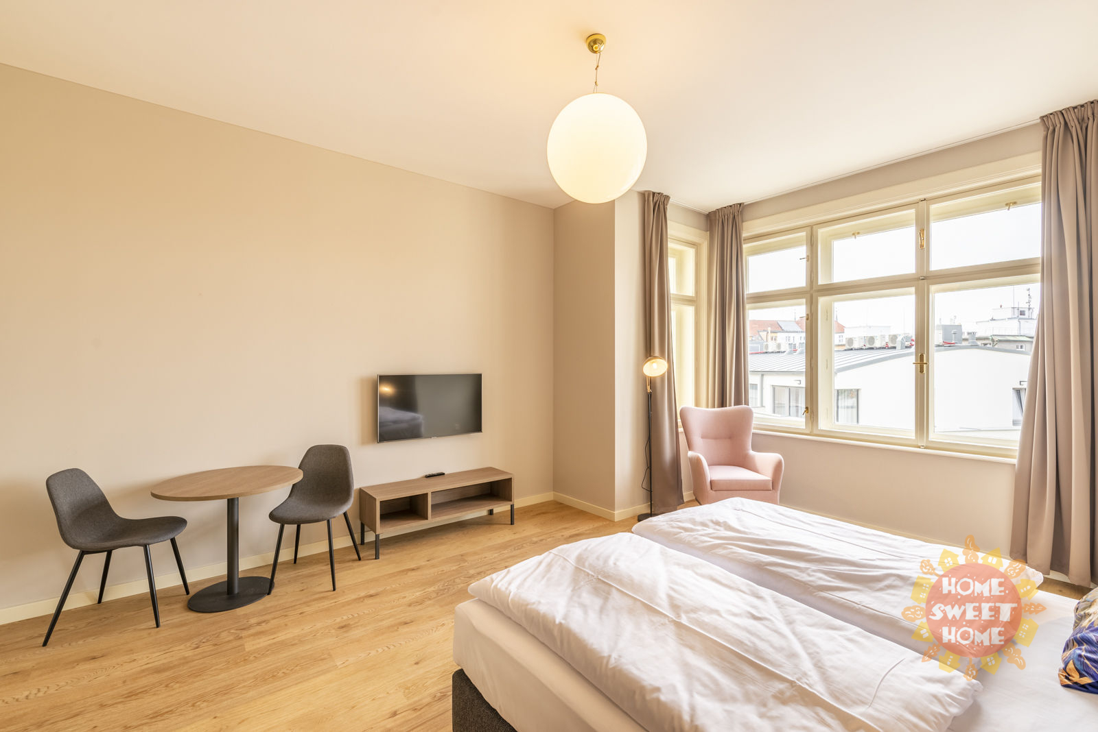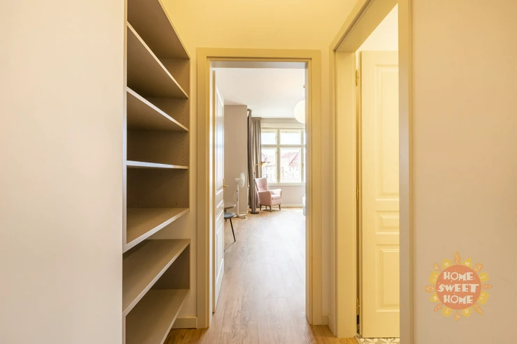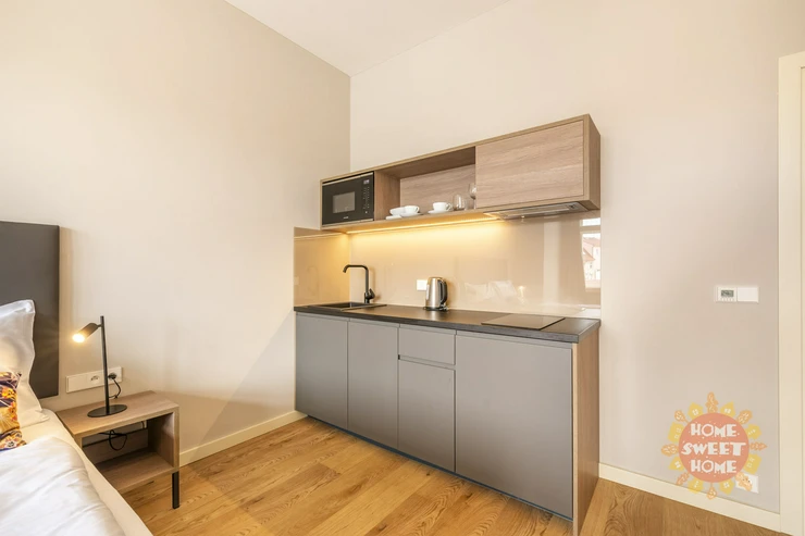 The apartment consists of a living room with a fully equipped kitchen, a bedroom and a bathroom with a shower and a toilet. The house has a 24/7 reception and a laundry room. The price of charges includes energy, high-speed Wi-Fi, 68 TV channels, garbage collection, cleaning of common areas, reception. Possibility to rent an apartment with services for an additional fee (regular cleaning, change of bed linen, bathroom cosmetics in BIO quality).