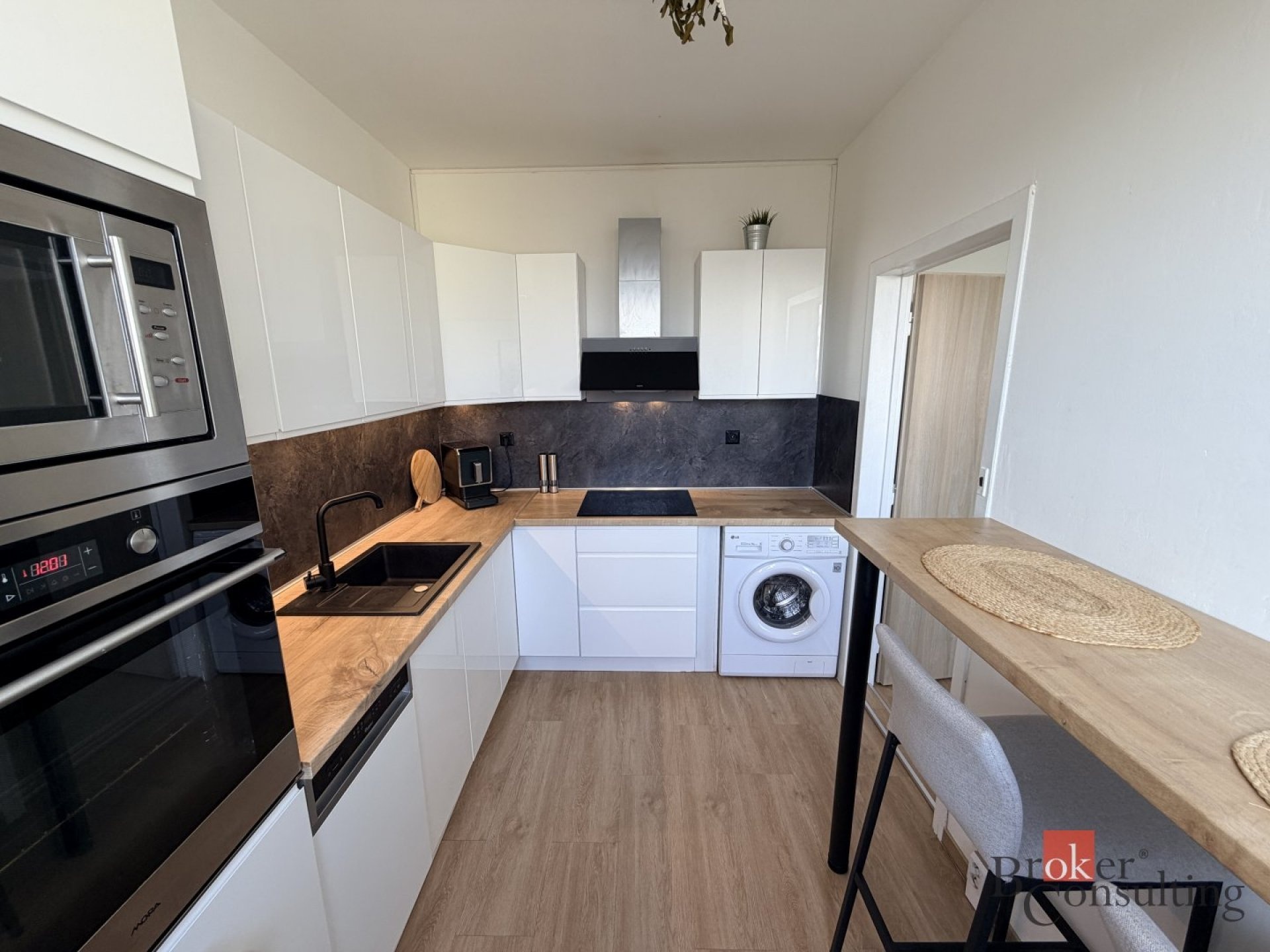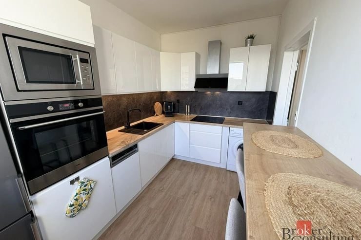 Kuchyně: Nová kuchyňská linka plně vybavena spotřebiči pračka, myčka (včetně lednice s mrazákem, varná deska, trouba).