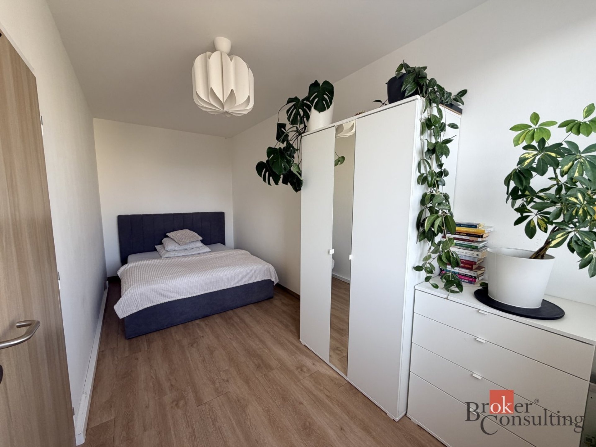 Ložnice je vybavena komodou a skříní.