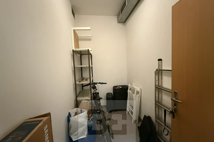 The apartment includes a practical storage unit/cage directly in front of the apartment