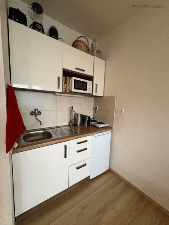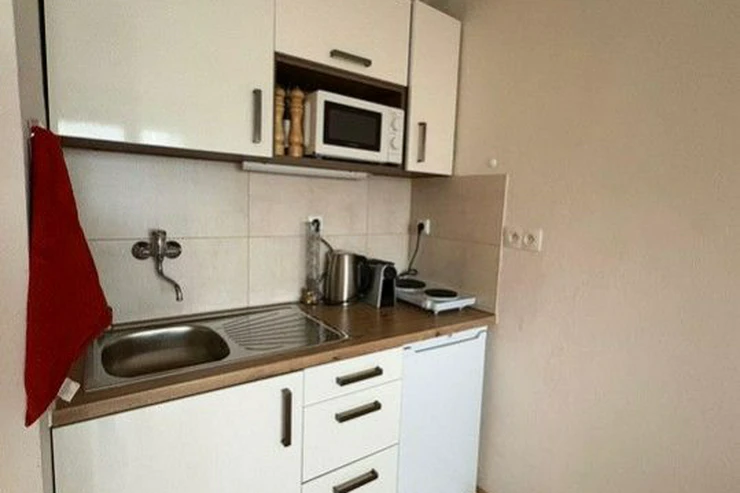 The apartment is equipped with a brand new kitchen unit with a refrigerator and a microwave.