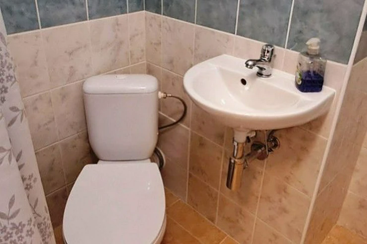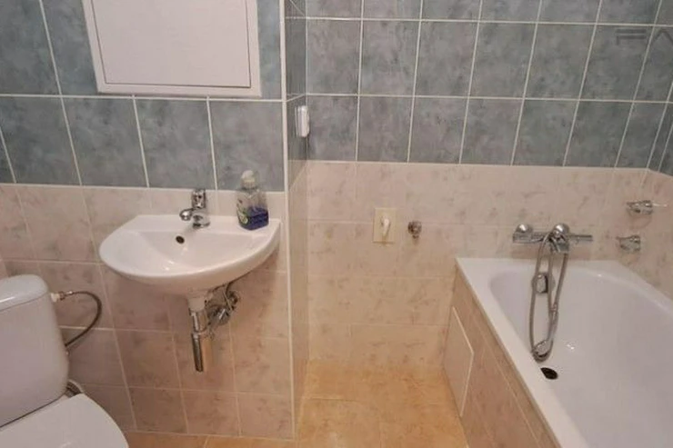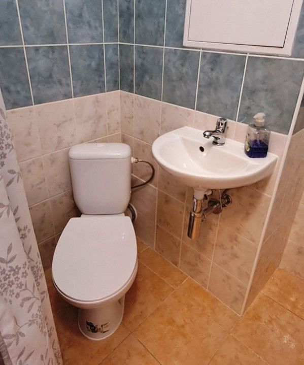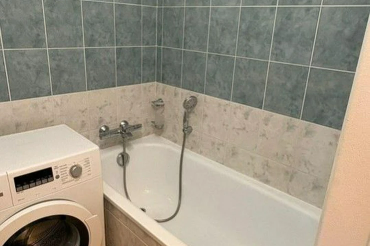 The bathroom has a bathtub, toilet, small sink. Washing machine by agreement.