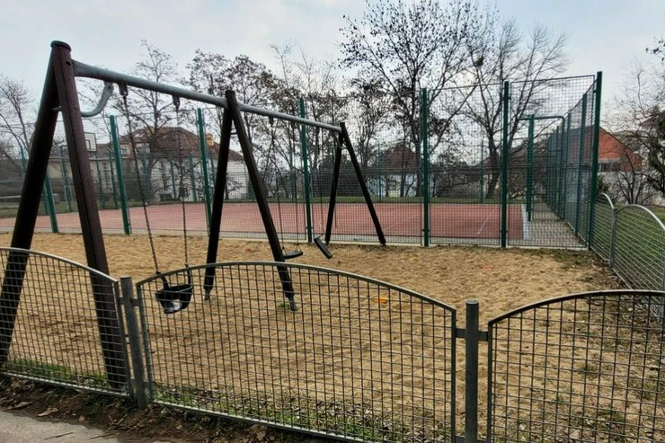 Next to the house there is a sports field with a basketball hoop, greenery. Blue zone parking.
