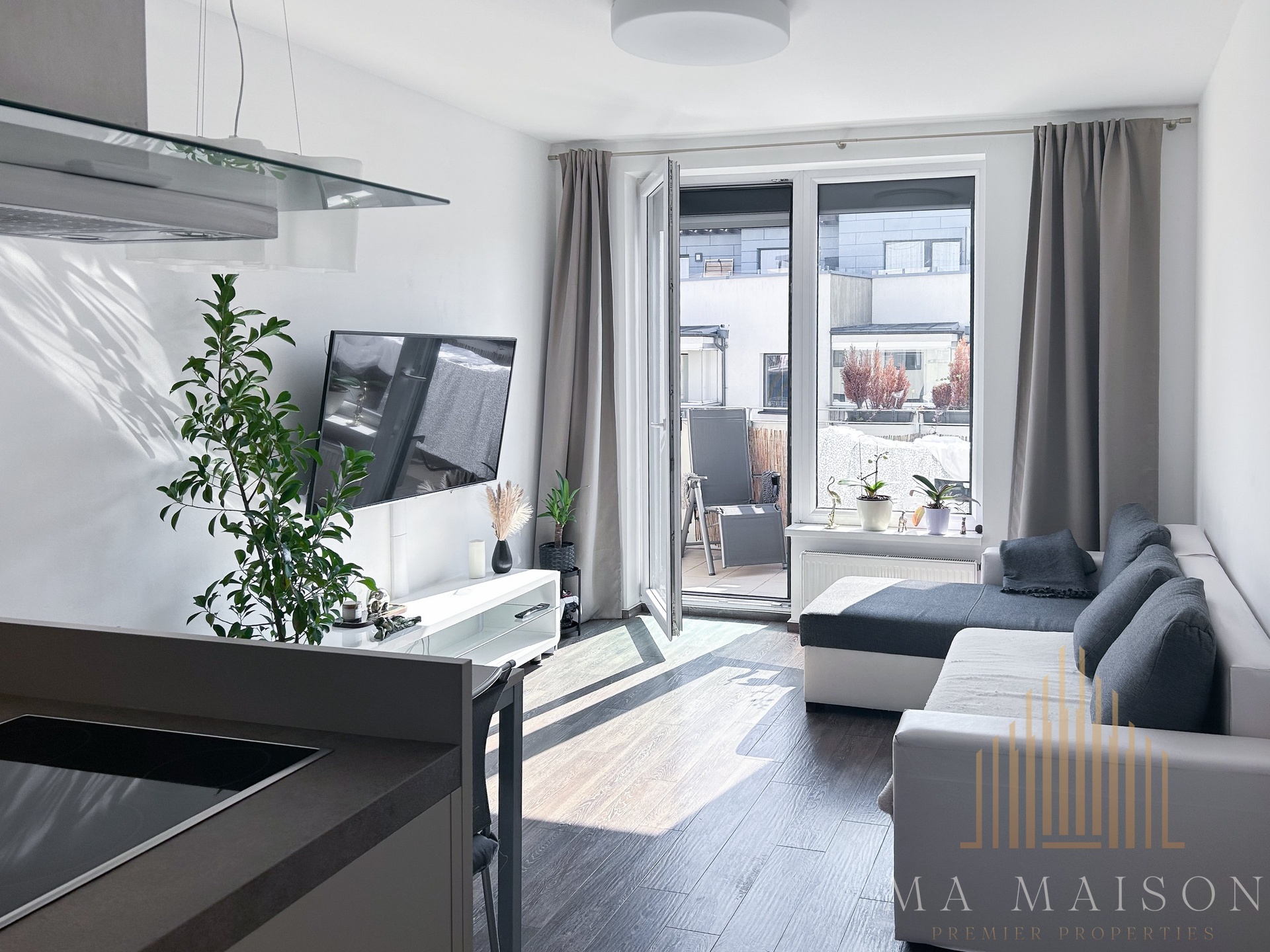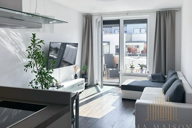 The apartment is situated on the 4th floor of a modern new building with an elevator. It consists of an entrance hall, a bathroom with a toilet, a living room with a kitchenette, and a separate bedroom. The apartment is offered unfurnished. The kitchen unit is part of the living area and provides plenty of storage space; it is equipped with a hob, oven, extractor hood, and a fridge with freezer.