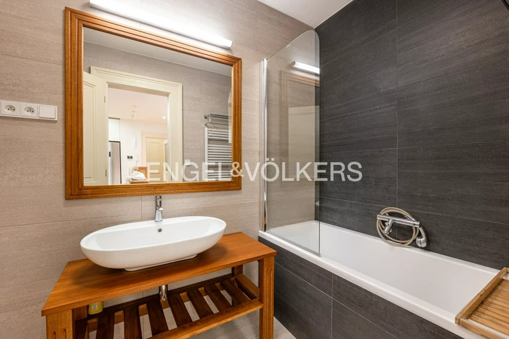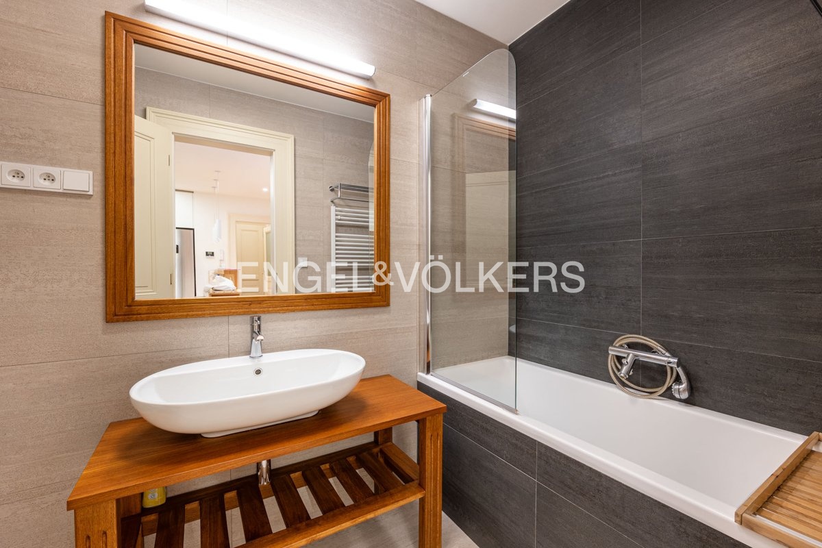 The interior consists of an entrance hall with built-in wardrobes, a spacious living room connected to a fully equipped kitchen (induction hob, oven, fridge-freezer, dishwasher, microwave), and two separate bedrooms. One of the bedrooms has its own en-suite bathroom with a shower, toilet, and bidet; the second bathroom, accessible from the hallway, is equipped with a bathtub, toilet, and bidet. The apartment also includes a utility room with a washing machine, dryer, and gas boiler. The living room faces the greenery of Svatopluk Čech Orchards, while the bedrooms face a quiet courtyard.