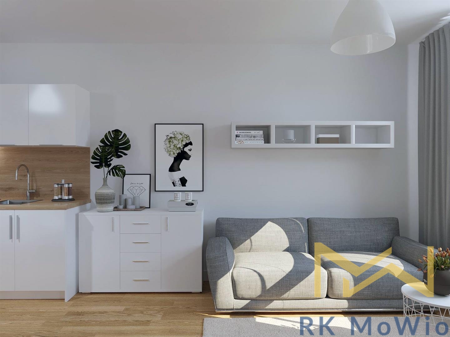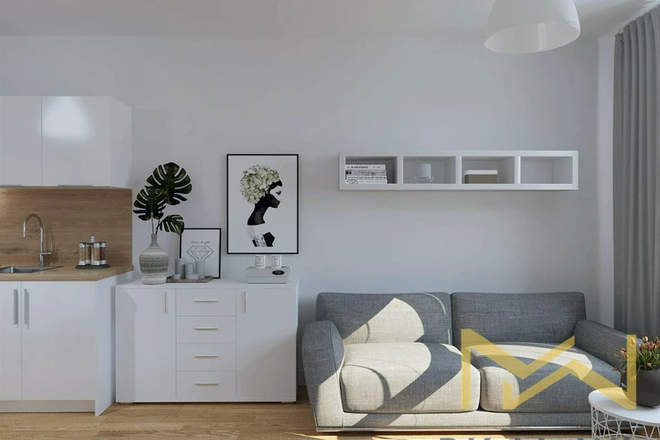 The layout consists of a spacious entrance hall with ample storage space, an open-plan living room with wooden flooring, tastefully furnished and connected to a fully equipped kitchenette (electric oven, hob, extractor hood). The living area also includes a dining space and a zone for relaxation and sleeping. The bathroom is equipped with a shower, washbasin, toilet, and washing machine. The apartment feels airy and offers a practical layout suitable for an individual or a couple. Photos are illustrative.