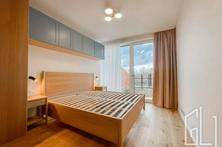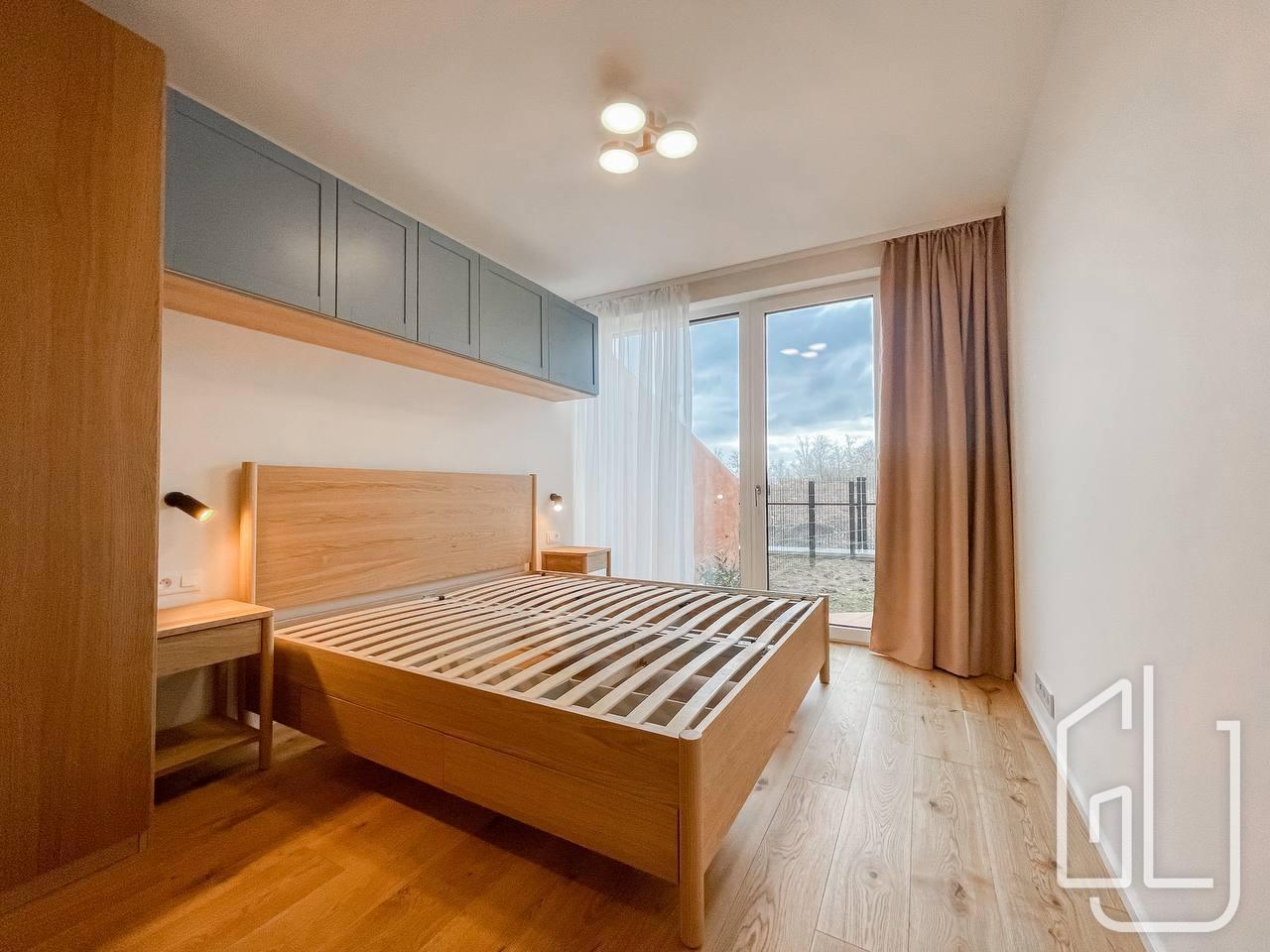 Ložnice je samostatná, klidná a rovněž má přístup na terasu, což zajišťuje příjemné propojení interiéru s venkovním prostorem. Součástí bytu je koupelna, praktická komora s místem pro pračku a sušičku a vstupní chodba s dostatkem úložného prostoru.