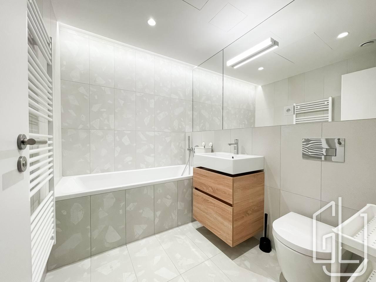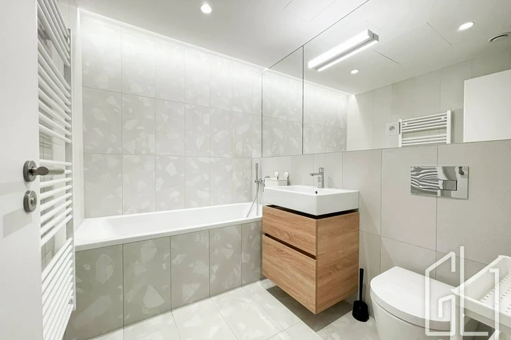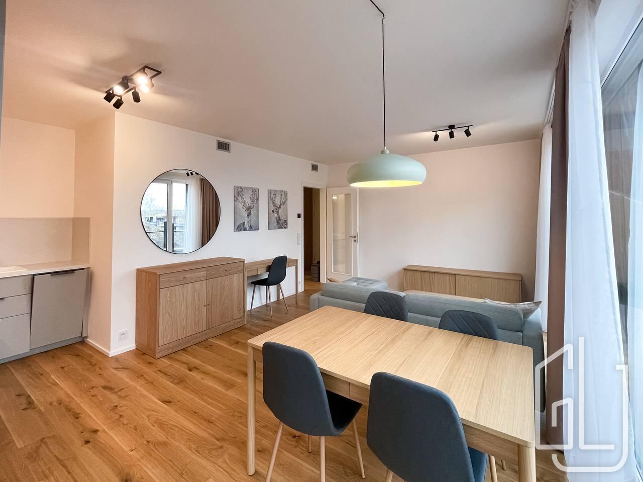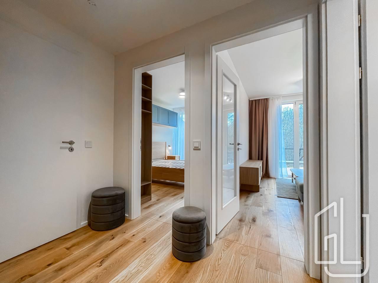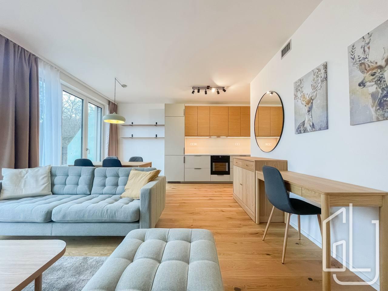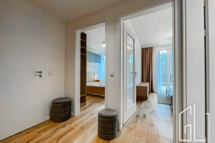 Byt je vybaven kvalitními materiály a moderními prvky, jako jsou dřevěné dubové podlahy, venkovní žaluzie a systém větrání s rekuperací.