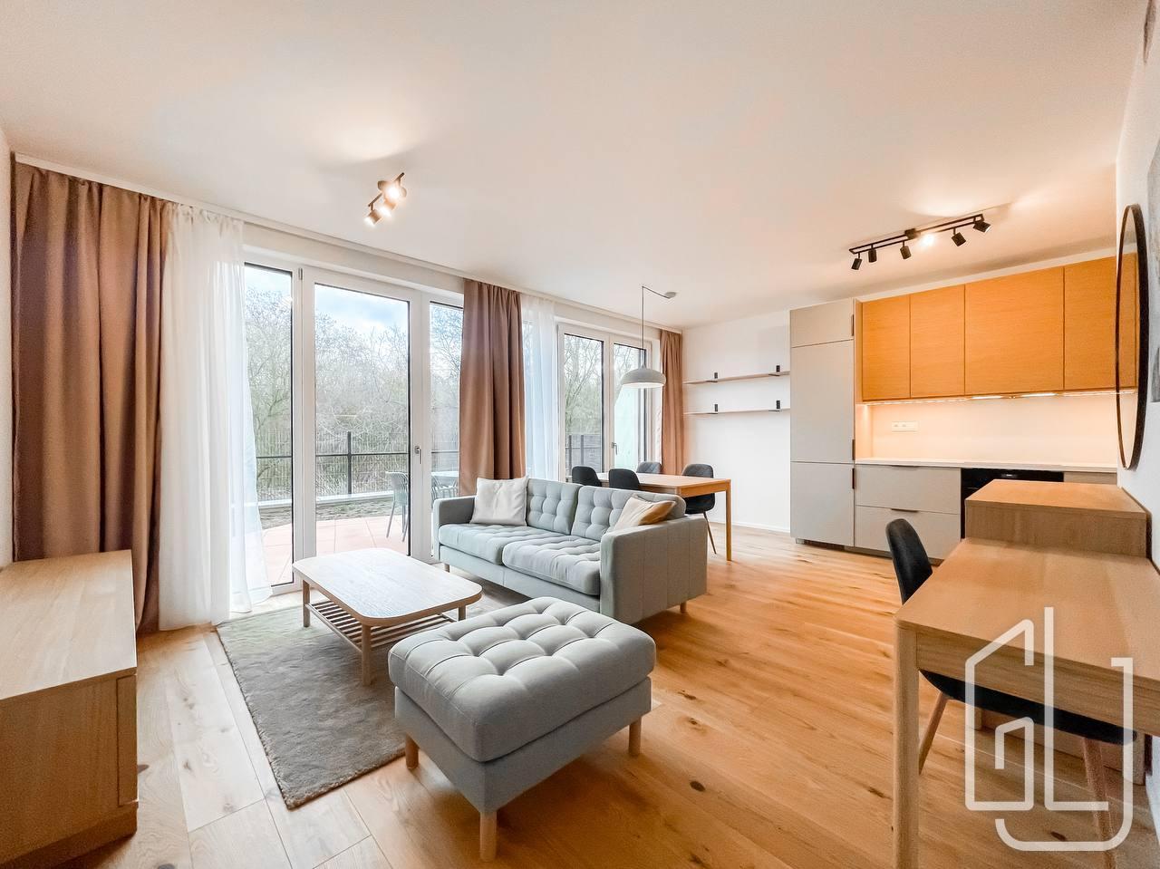 Byt nabízí promyšlenou dispozici 2+kk s prostorným obývacím pokojem a plně vybaveným kuchyňským koutem, který zahrnuje varnou desku, troubu, lednici, mrazák a myčku nádobí. Obývací pokoj plynule navazuje na jídelní část a má přímý vstup na terasu a do soukromé zahrádky, která je ideální pro relaxaci a posezení.