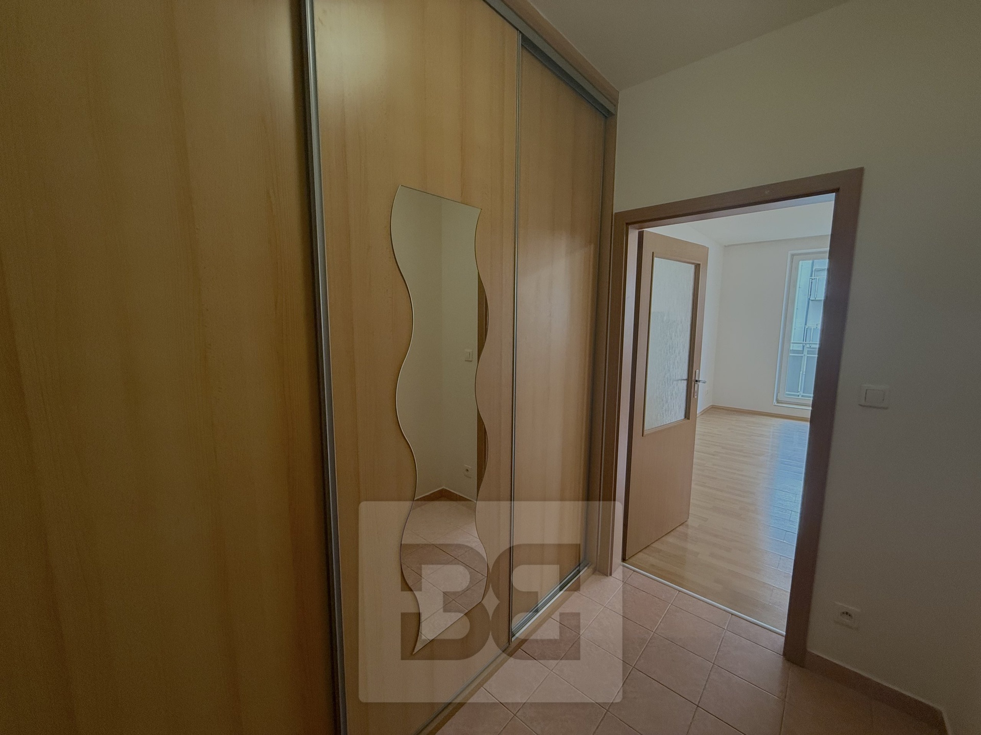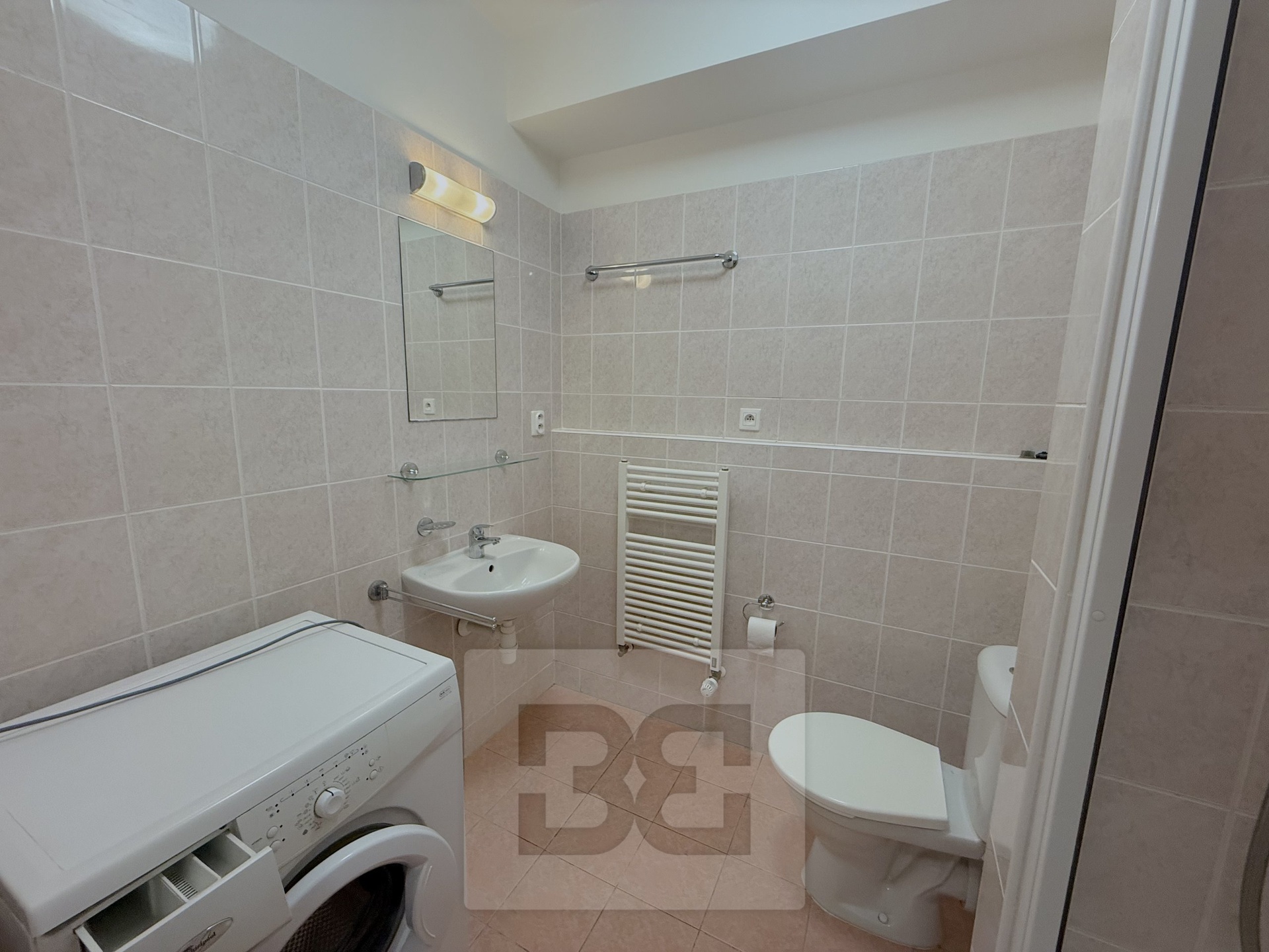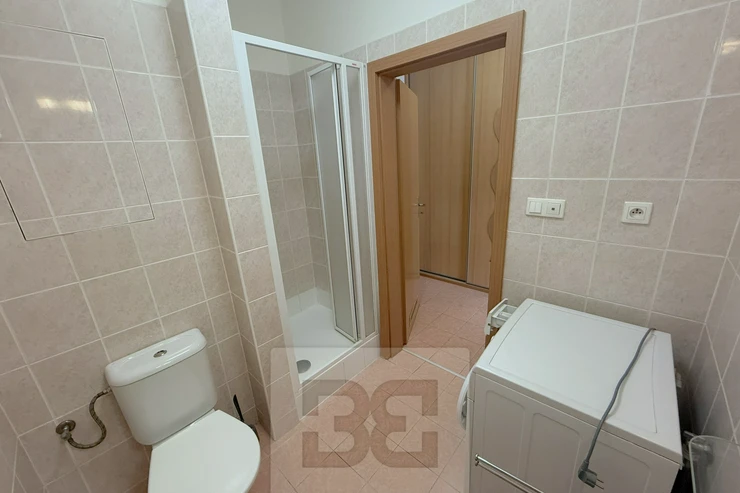 The apartment has a hallway with built-in wardrobe, from where we get to the main room with equipped kitchen ( induction hob, electric oven, dishwasher, fridge). In the bathroom we find a shower, toilet and washing machine.