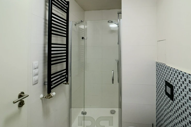 The apartment consists of an entrance hall, a practical niche for a washing machine, a spacious bathroom with a shower, a living room with a kitchenette, and a separate bedroom. The kitchen is equipped with a high-quality Oresi kitchen unit. Apartments in this project are characterized by a high standard of workmanship and quality finishes.