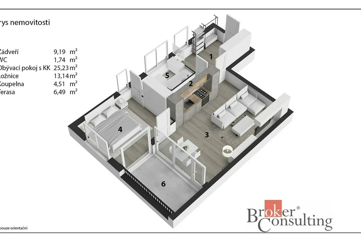 Byt je situován v 6. patře, tedy v nejvyšším podlaží domu, což zajišťuje dostatek světla, soukromí a příjemný výhled. Velkou výhodou je terasa, která nabízí ideální prostor pro relaxaci.