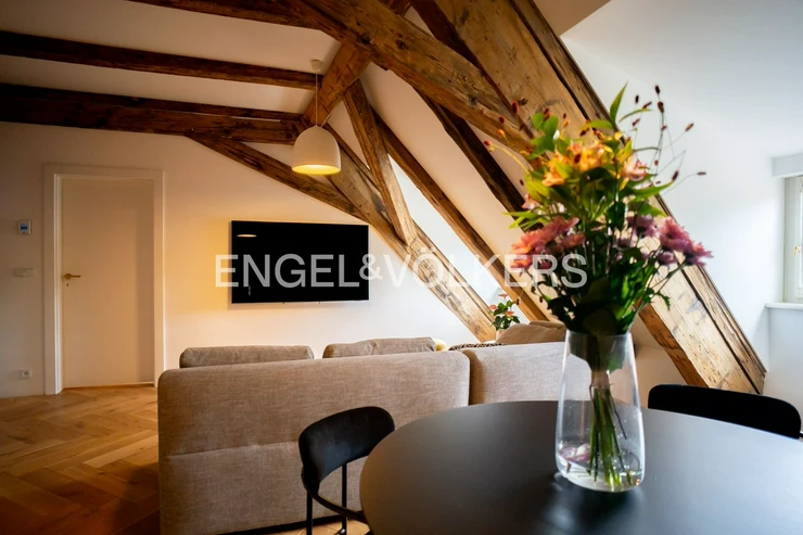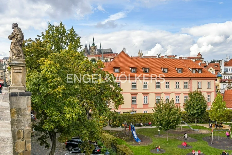 Unique layout with a separate bedroom with built-in wardrobe and en-suite bathroom overlooking the Charles Bridge, generous living room, and kitchen. Bespoke kitchen fully equipped with Miele appliances.