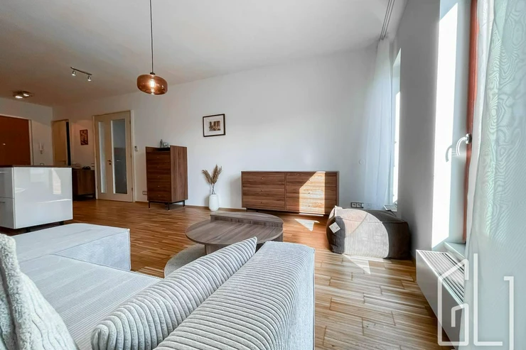 Byt nabízí dispozici 2+kk se světlým obývacím pokojem a plně vybavenou kuchyní s ostrůvkem, kterou lze variabilně přizpůsobit dle potřeb nájemce. Obývací prostor je vybaven kvalitní dřevěnou podlahou a poskytuje dostatek místa pro pohodlné bydlení.