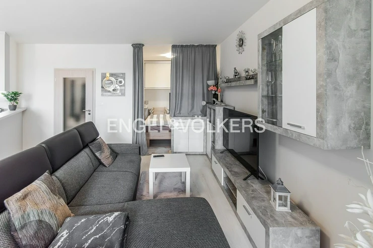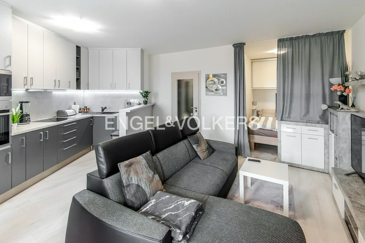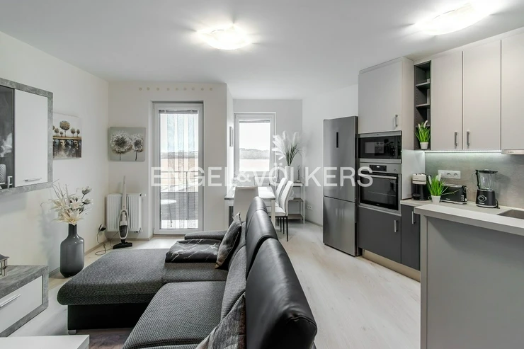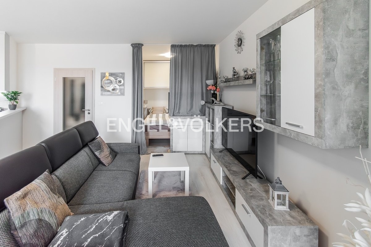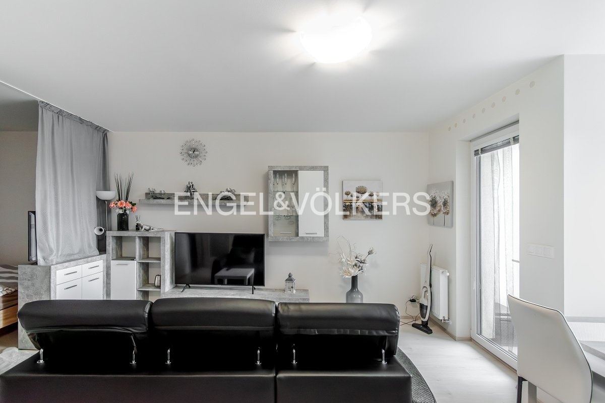 A modern, fully furnished studio apartment with a balcony, a basement storage unit, and a garage parking space in the Veselská residence, Prague 9 – Letňany.