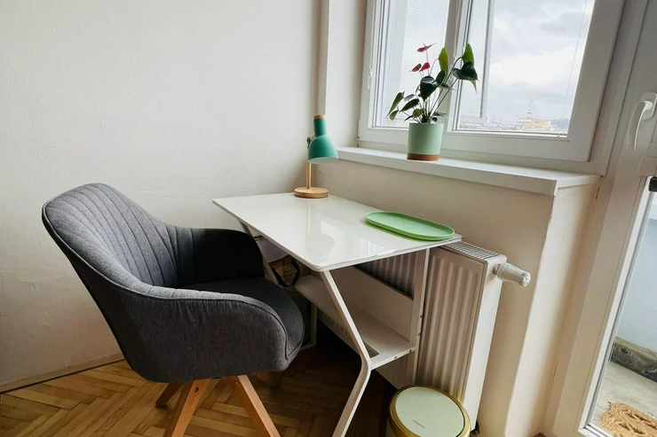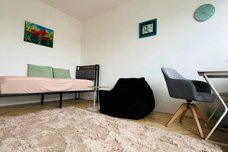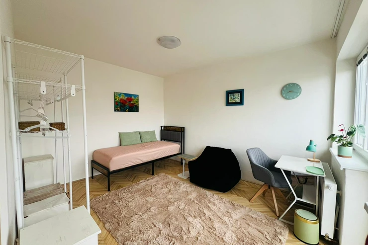 A beautifully designed, fully furnished room available in a quiet and well-maintained 3-room apartment located on the top floor, offering privacy, comfort, and charming city views from a private balcony.