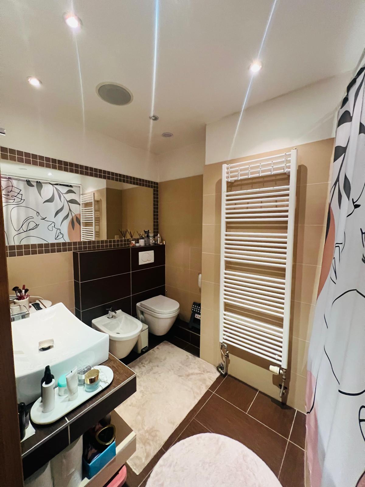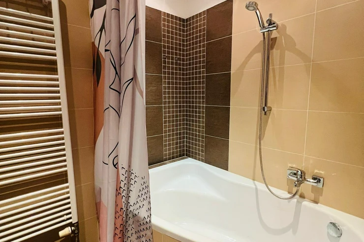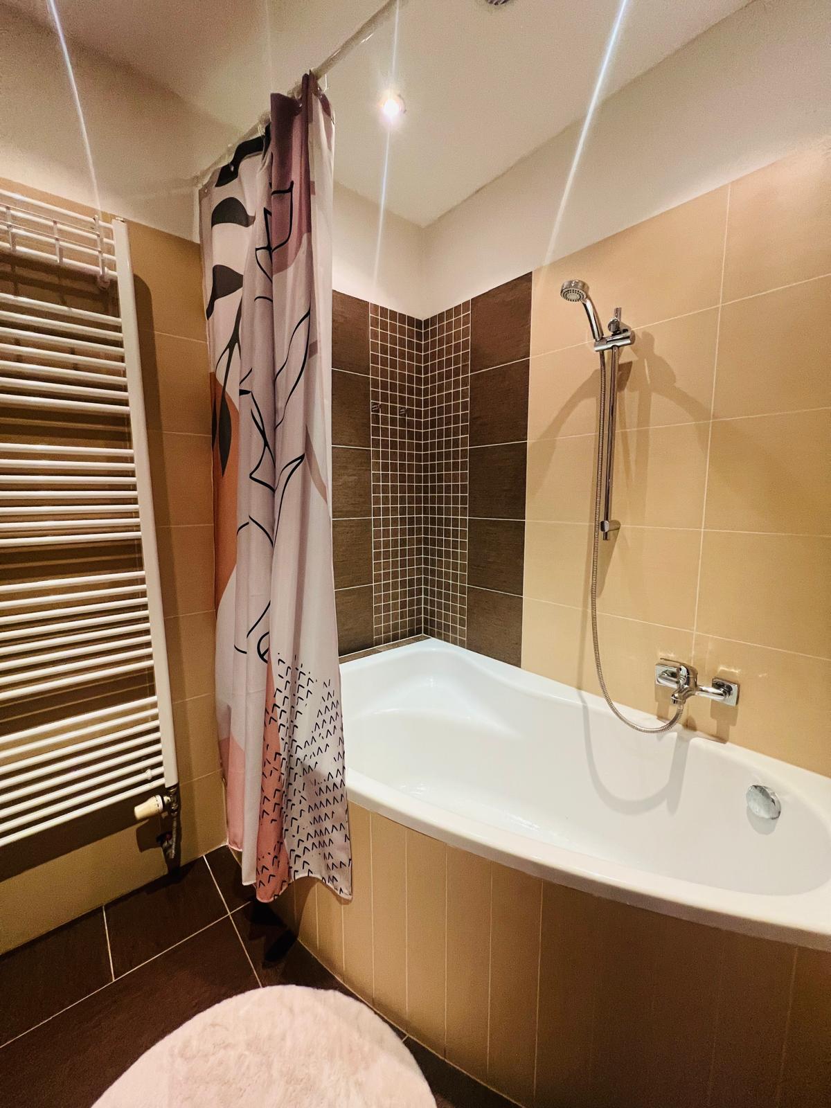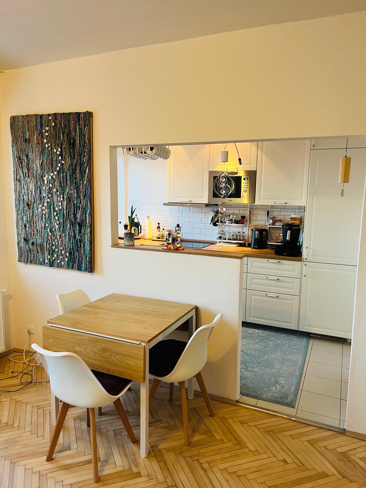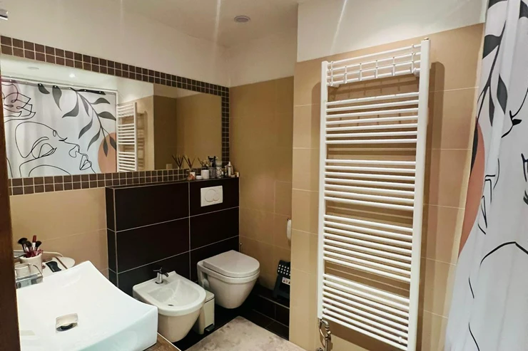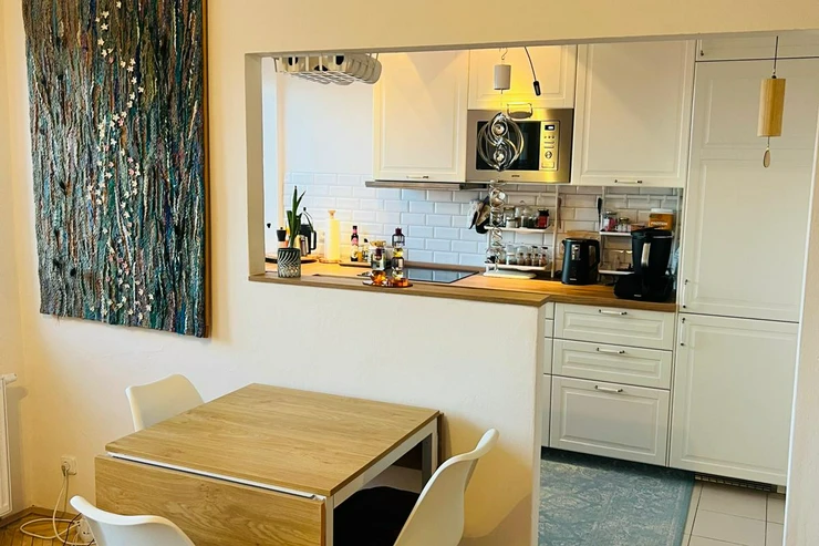 The apartment includes a fully equipped modern kitchen and a spacious bathroom with a bathtub and bidet. Only one other resident – an adult woman with a separate bedroom – ensuring a calm, respectful living environment.