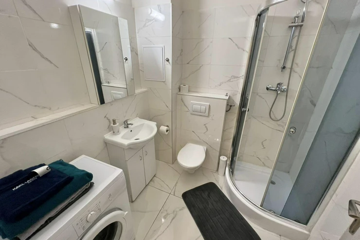Interiér bytu činí obývací pokoj, kuchyň v předsíni, koupelna s vanou, toaletou a pračkou a vstupní hala. Z obývacího pokoje je přistup na prostornou terasu s pěkným výhledem do okolí. Byt bude kompletně zařízen novým moderním nábytkem.