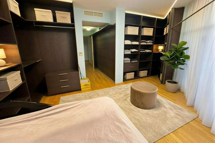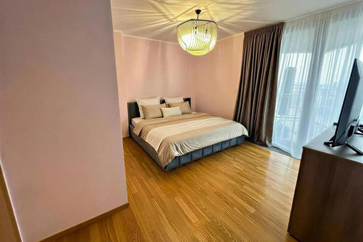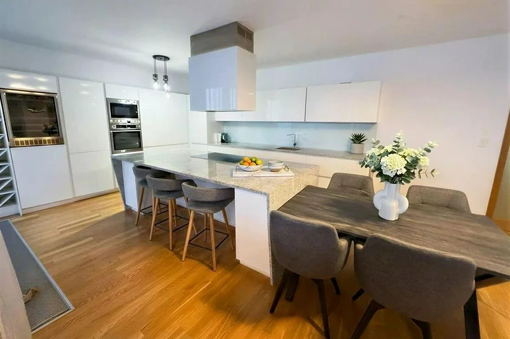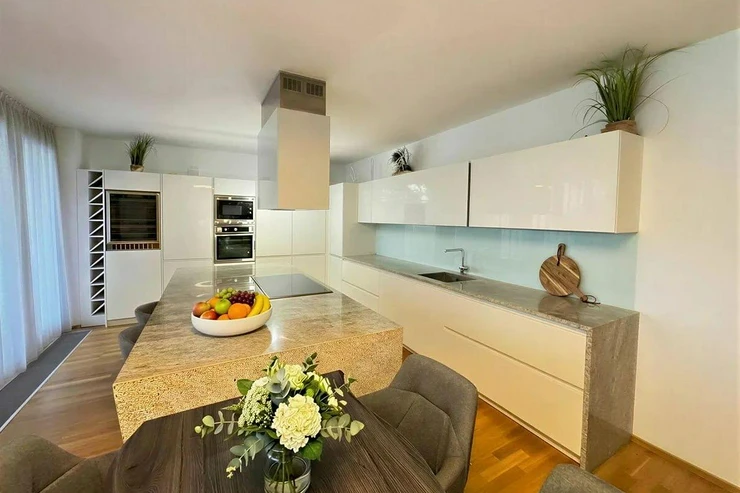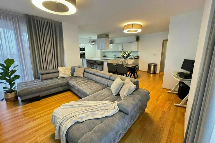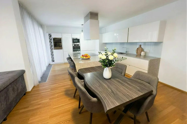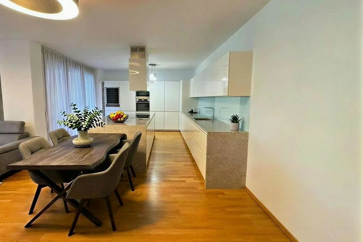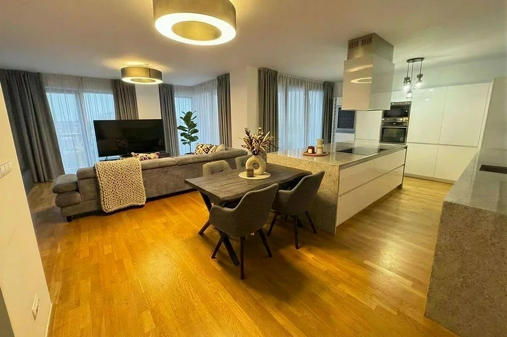 Tato nadstandardní nemovitost je kompletně zařízená s důrazem na detail a připravena k okamžitému nastěhování. Dominantou bytu je světlý a vzdušný obývací prostor s plně vybaveným kuchyňským koutem, jídelní částí, designovou sedací soupravou a TV. Kuchyň disponuje všemi vestavěnými spotřebiči (varná deska, trouba, myčka, lednice, mikrovlnná trouba).