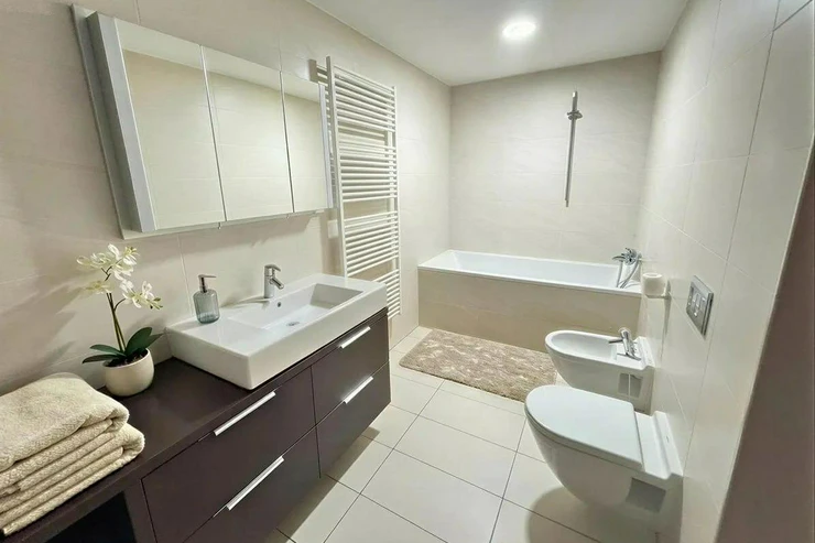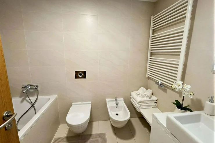 K dispozici jsou tři elegantní koupelny (vana / sprchový kout, toaleta) a samostatná toaleta pro hosty.