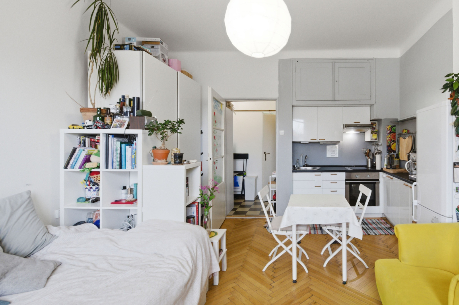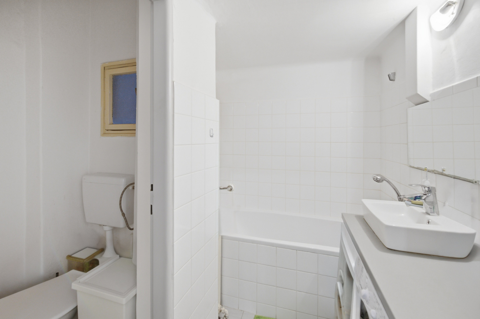 entrance hall, one room with a kitchenette (ceramic double hob, dishwasher, oven, refrigerator). bathroom with bathtub, washing machine and toilet. The apartment includes a cellar.