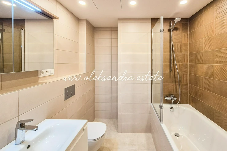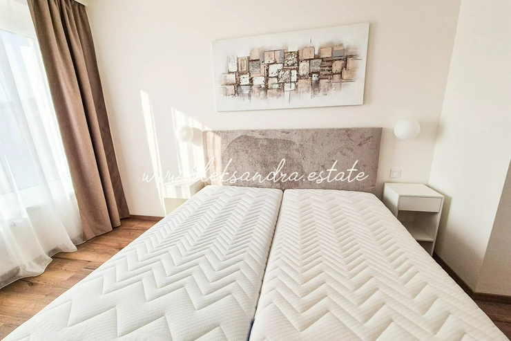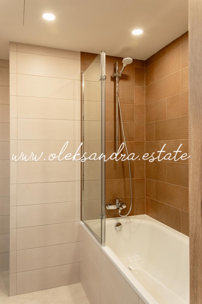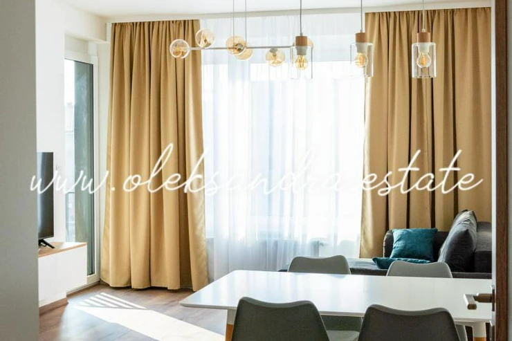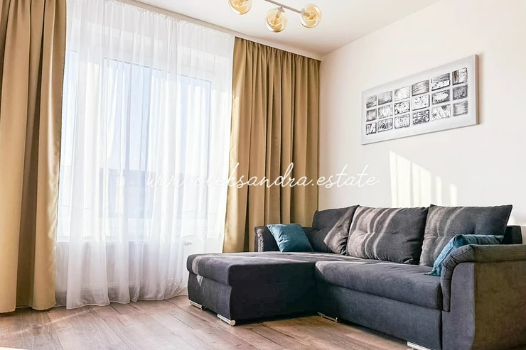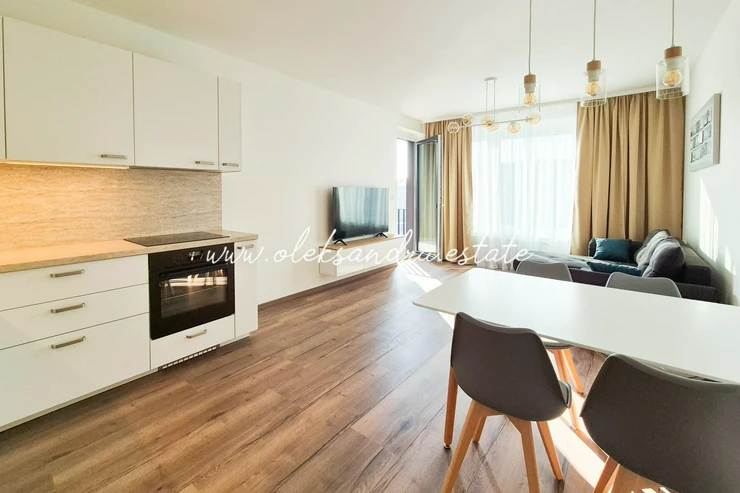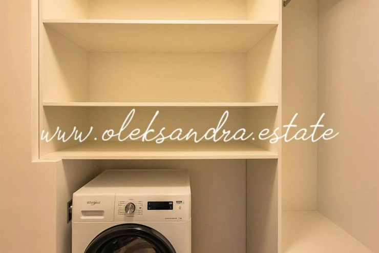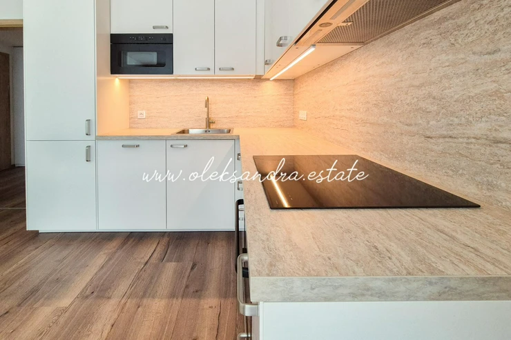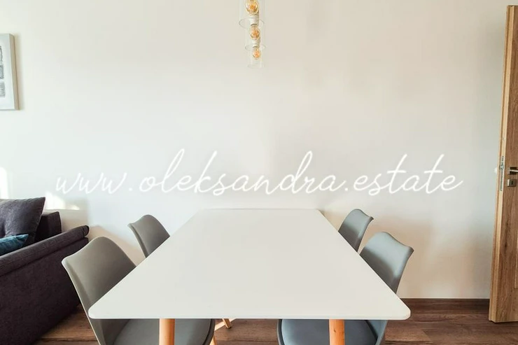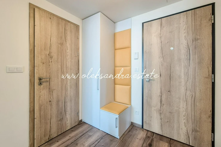 Jedná se kompletně zařízený byt. Nábytek na míru nabízí dostatek úložného prostoru. V bytě je velký a chytře řešený kuchyňský kout vybaven lednicí, myčkou, troubou, indukční deskou a digestoří. Další část bytu tvoří obývací prostor s rozkládací pohovkou, odkladacím stolkem a stolkem pod TV. Ložnice je zařízená velkou postelí s úložným prostorem a velkou šatní skříní. Celkově je byt velice moderně zařízený kvalitním nábytkem. V bytě je také velká komora s pračkou.