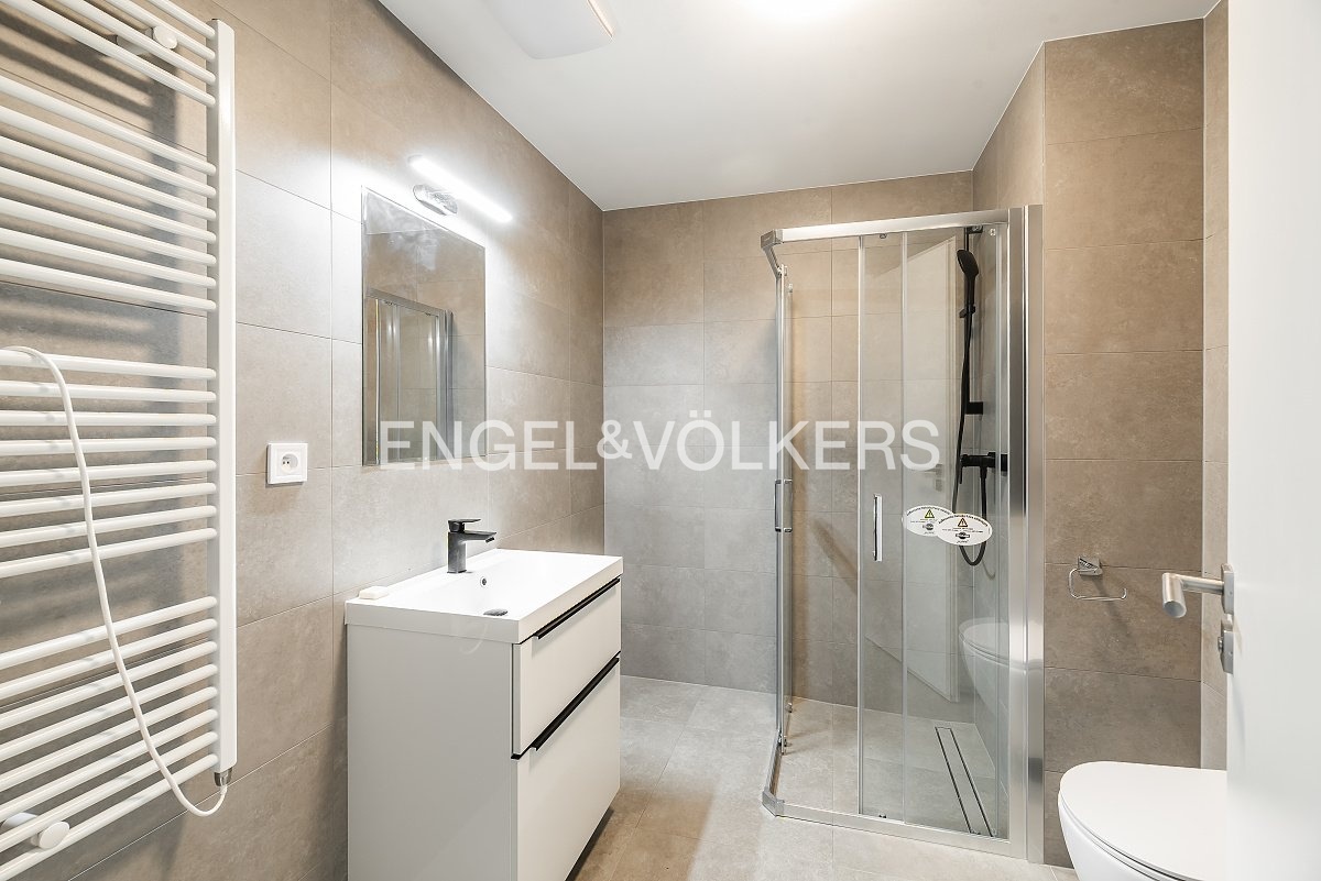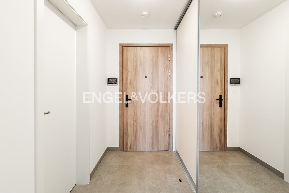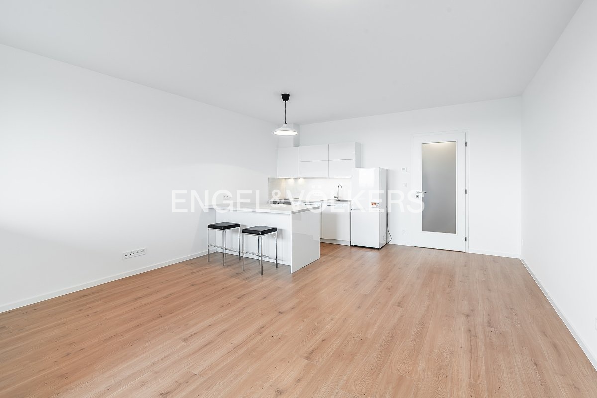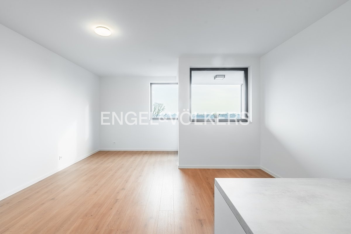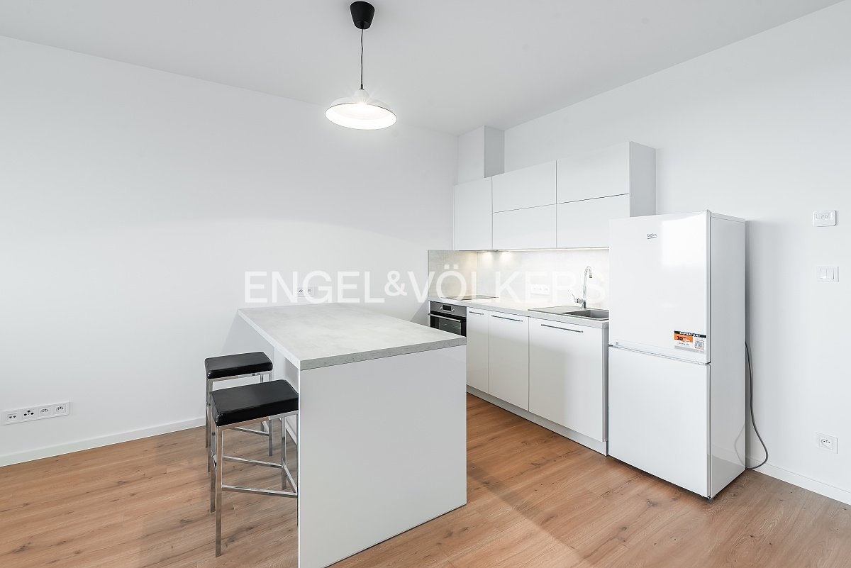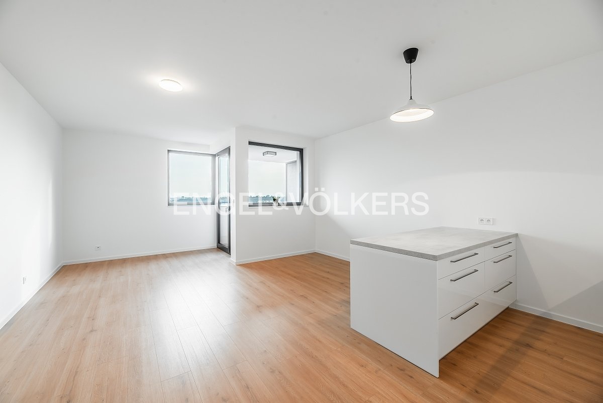 We are offering a new studio apartment with a balcony and panoramic views for long-term rent. The apartment is located in the new Vysočanská Vyhlídka development project; its location provides excellent access to the city centre, and Klíčovský Park is right next to the residence. The apartment features a fully equipped kitchen with high-quality appliances, a parking space in the underground garage, and a storage unit in the basement.