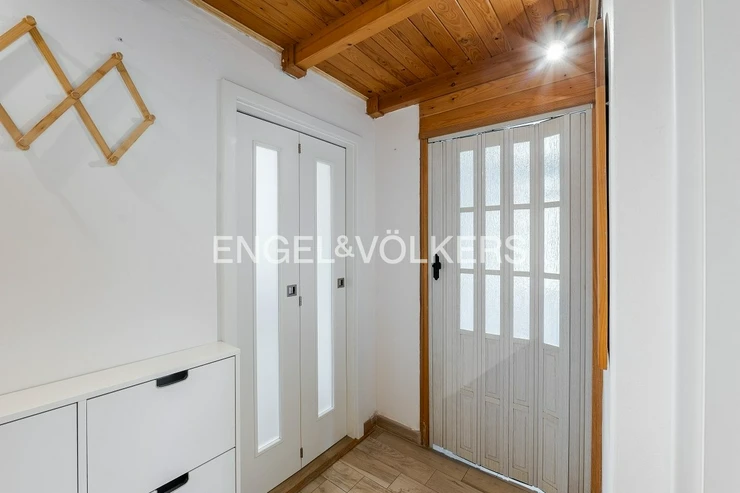 The apartment offers peaceful and comfortable living with an emphasis on elegant design and functionality. Its layout consists of a spacious living room connected to a modern kitchenette equipped with high-quality built-in appliances, a bedroom with ample storage space, a bathroom with a shower and washing machine, and a built-in storage area accessible from the bathroom above the wooden ceiling of the entrance hall.