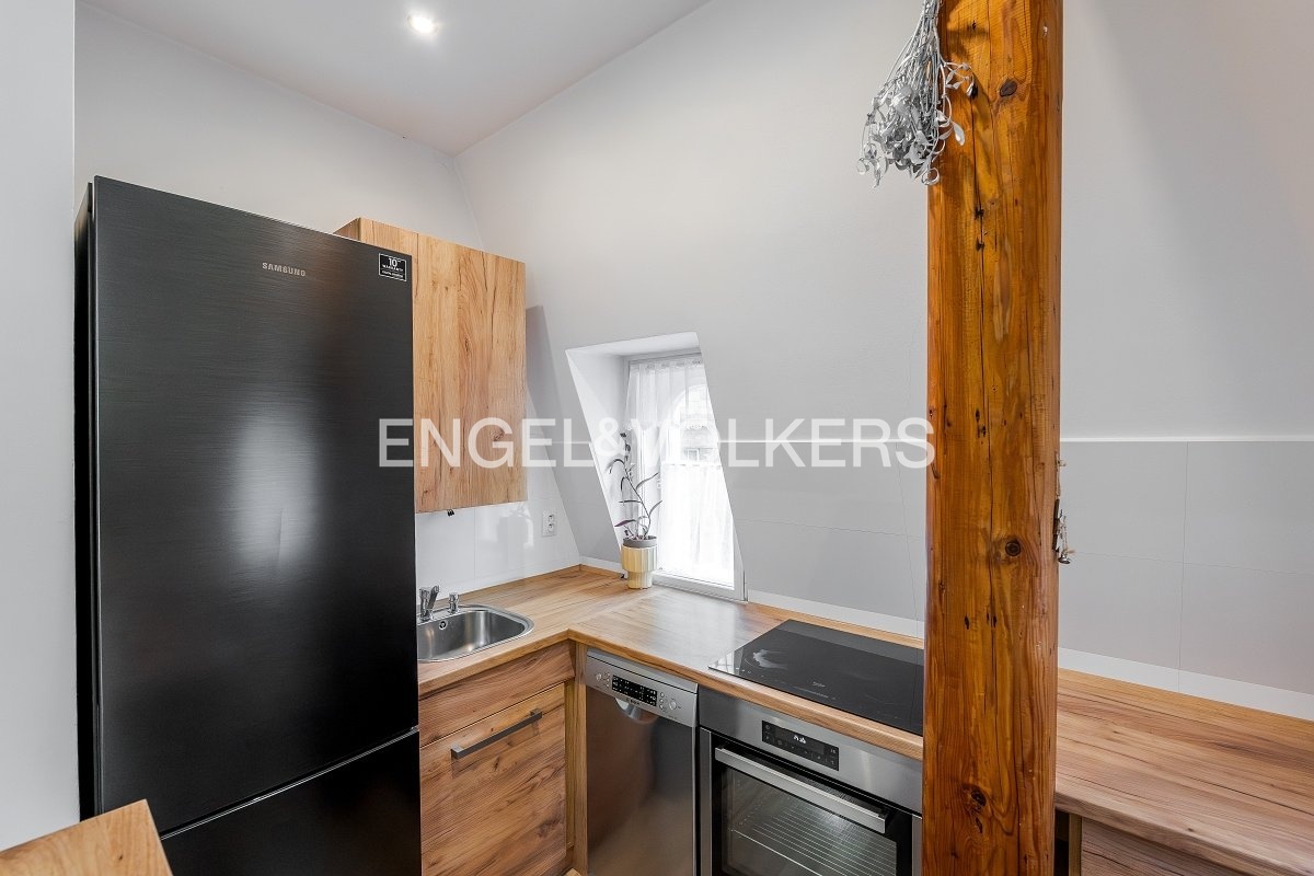 The interior is decorated in light, harmonious tones and furnished with custom-made designer furniture. The apartment includes a private garden, a brick cellar of 5 sqm, and a shared drying room.